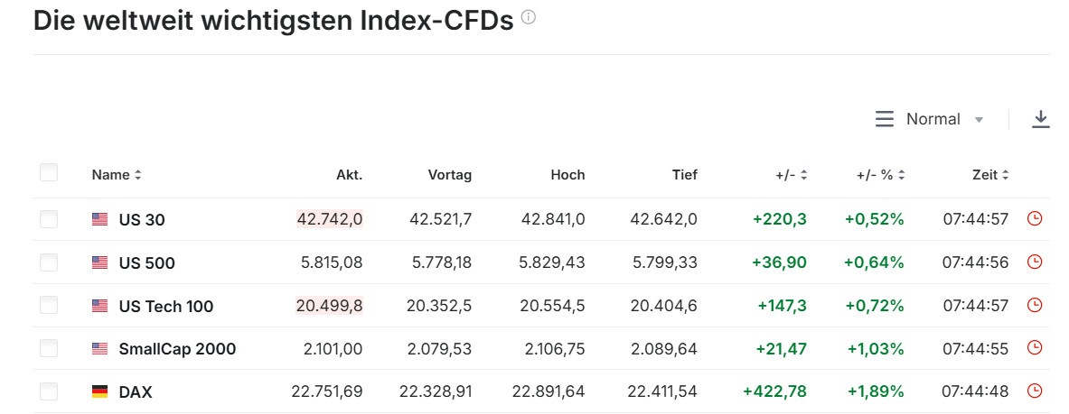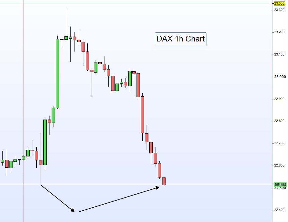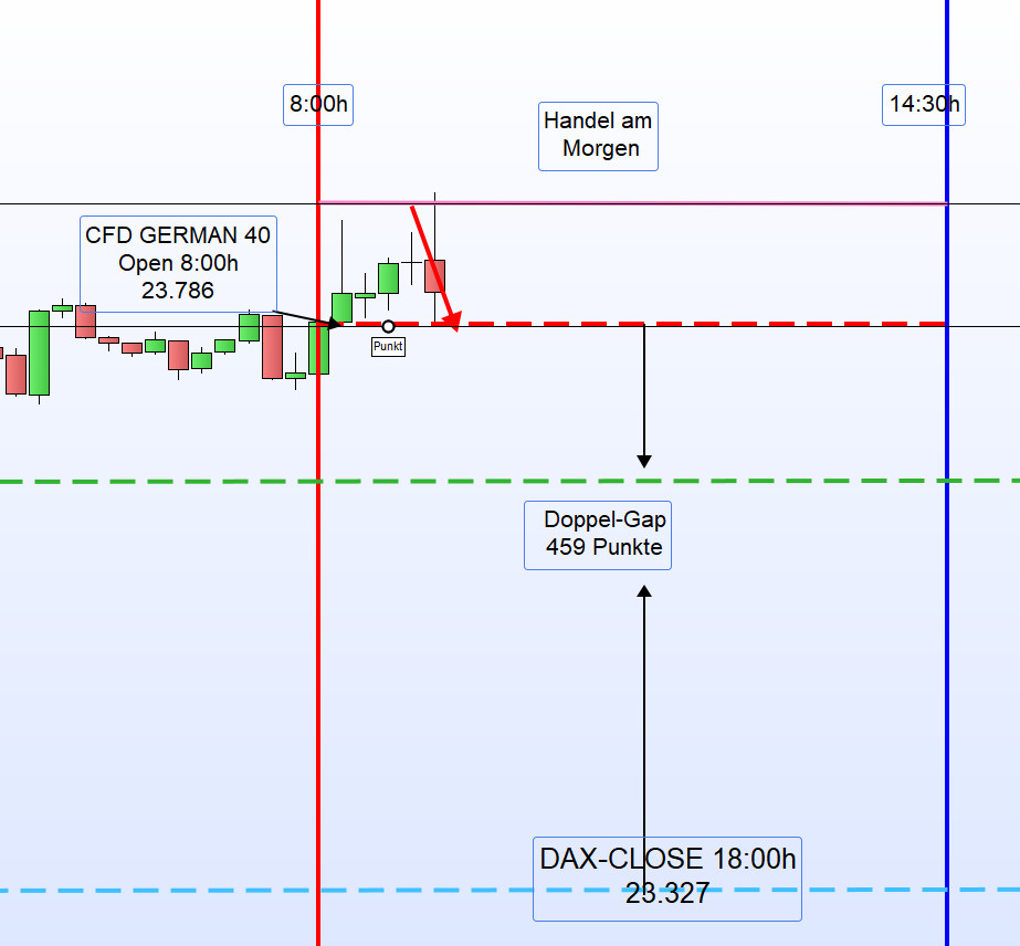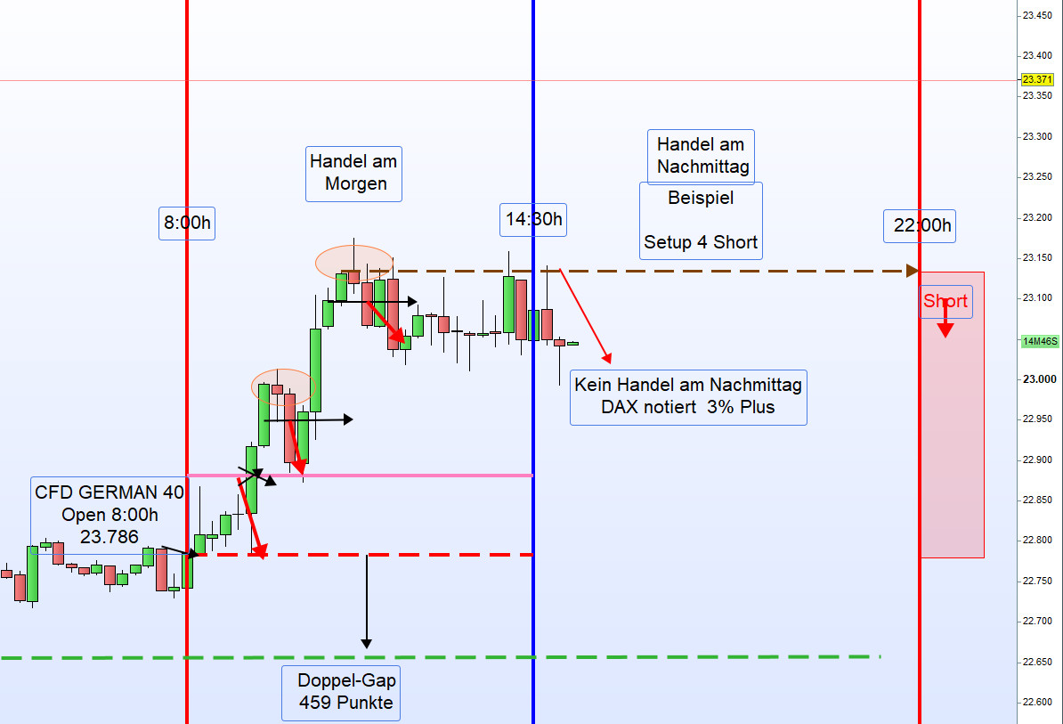 Für den CFD-Handel betrachten wir die Zeit von 8:00 bis 9:00 Uhr als Vorbörse. Besonderes Augenmerk liegt jedoch auf der XETRA-DAX-Eröffnung um 9:00 Uhr. Zu diesem Zeitpunkt notierte der DAX bereits 1 % im Minus. Eine erneute Long-Position sollte daher nur bei einer deutlichen Umkehrkerze eingegangen werden. -