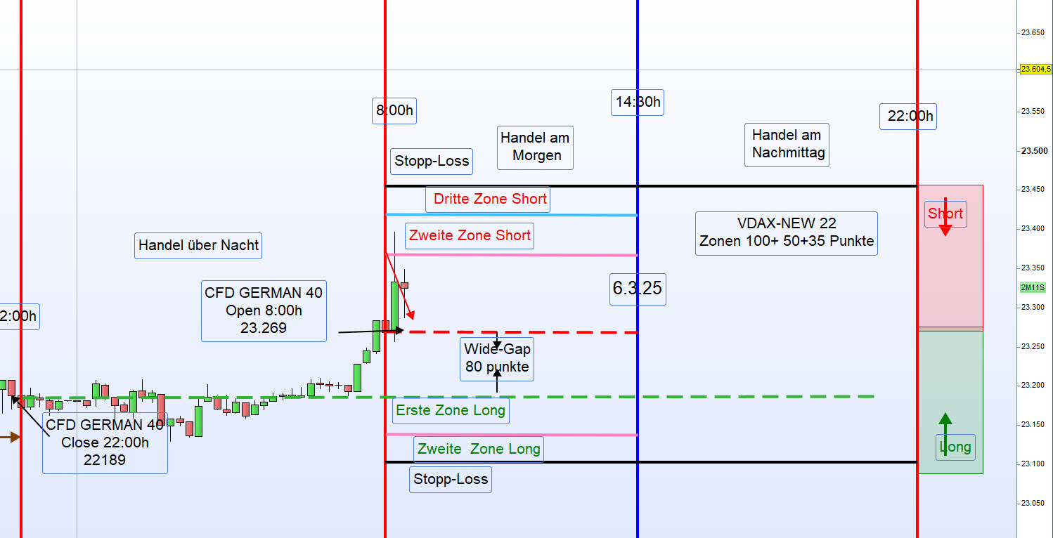 Nach der Eröffnung um 8:00 Uhr wurde der Trading-Chart erstellt und analysiert. Entsprechend war ein Zonenhandel angebracht, auch weil zu diesem Zeitpunkt die US-CFDs leicht im Plus notierten.
