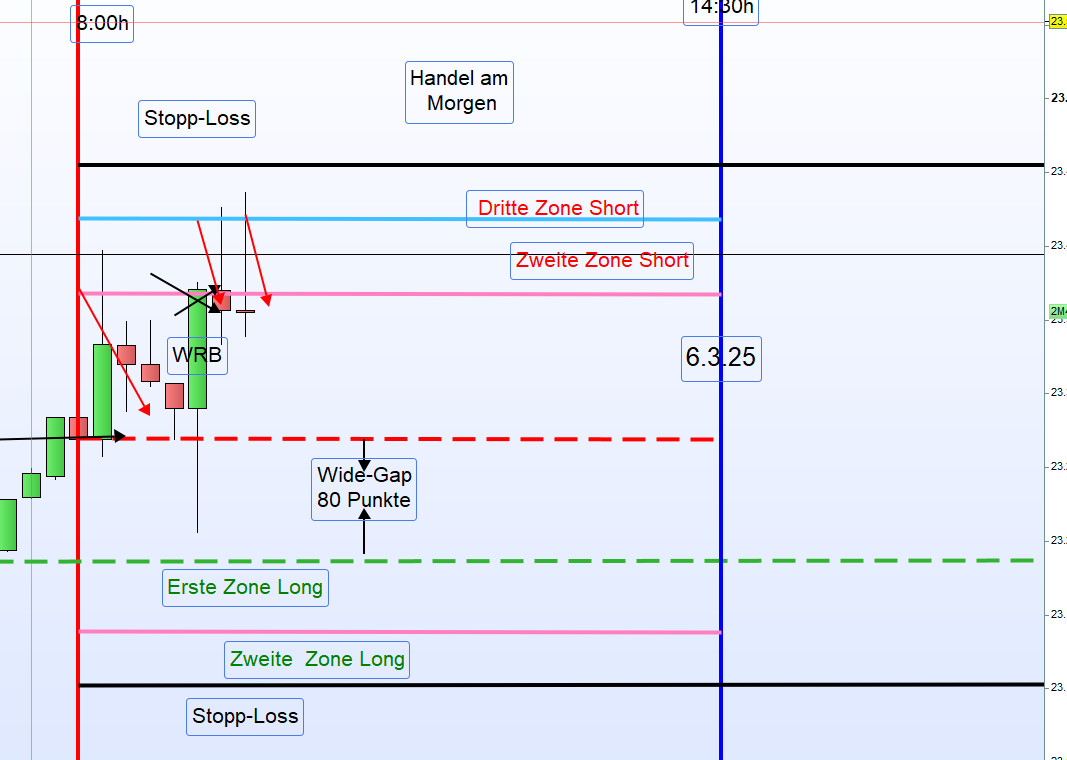 Der Chart für den Folgetag wurde vorbereitet, wobei die relevanten Zonen und möglichen Handelsbereiche bereits markiert wurden.