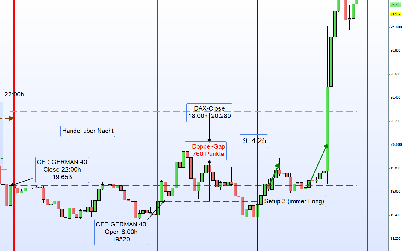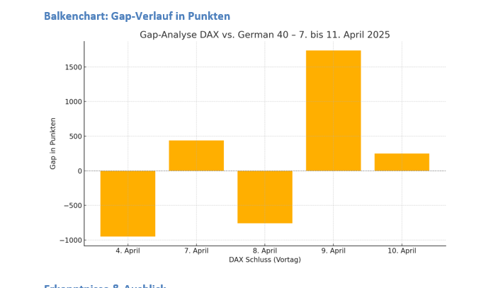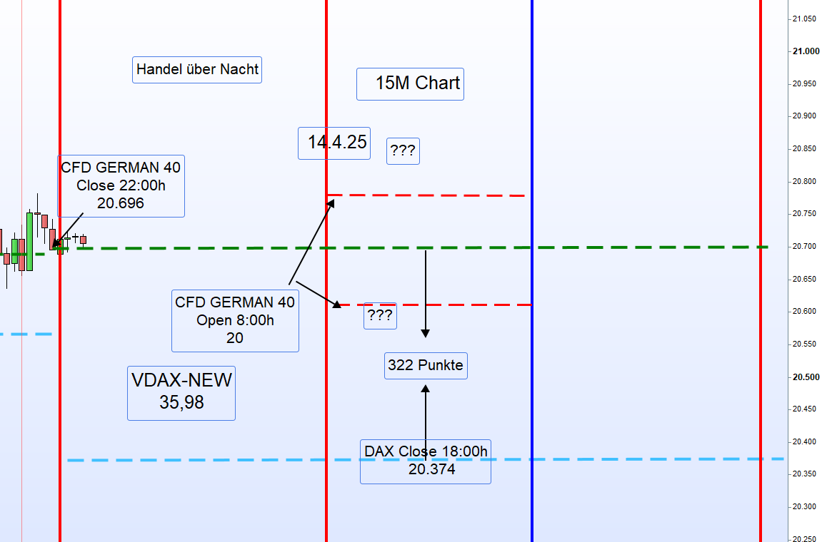 Heute am Sonntag liegen uns bereits einige relevante Daten zur Vorbereitung auf den morgigen Handelsstart vor:- Schlusskurs des German 40 (CFD) am Freitag, 11. April um 22:00 Uhr: 20.696 Punkte- DAX XETRA-Schlusskurs am Freitag um 18:00 Uhr: 20.374 Punkte- Vorläufiges Gap: +322 Punkte- VDAX-NEW-Notierung zum Wochenschluss: 35,98 (hohe Volatilität)Die entscheidende Unbekannte für den morgigen Handelsstart ist der Eröffnungskurs am Montag um 8:00 Uhr, wenn der German 40 offiziell in den Handel geht.