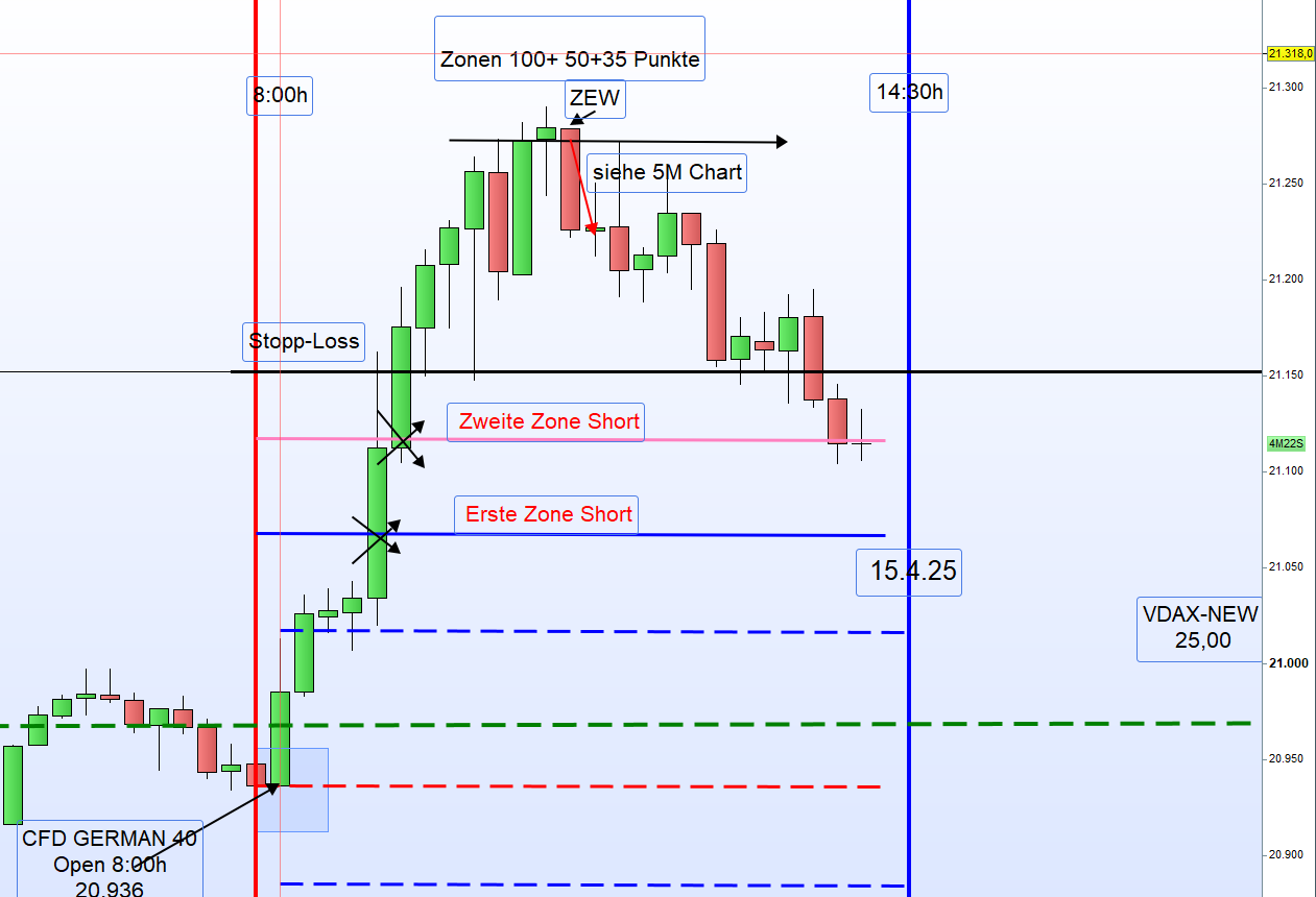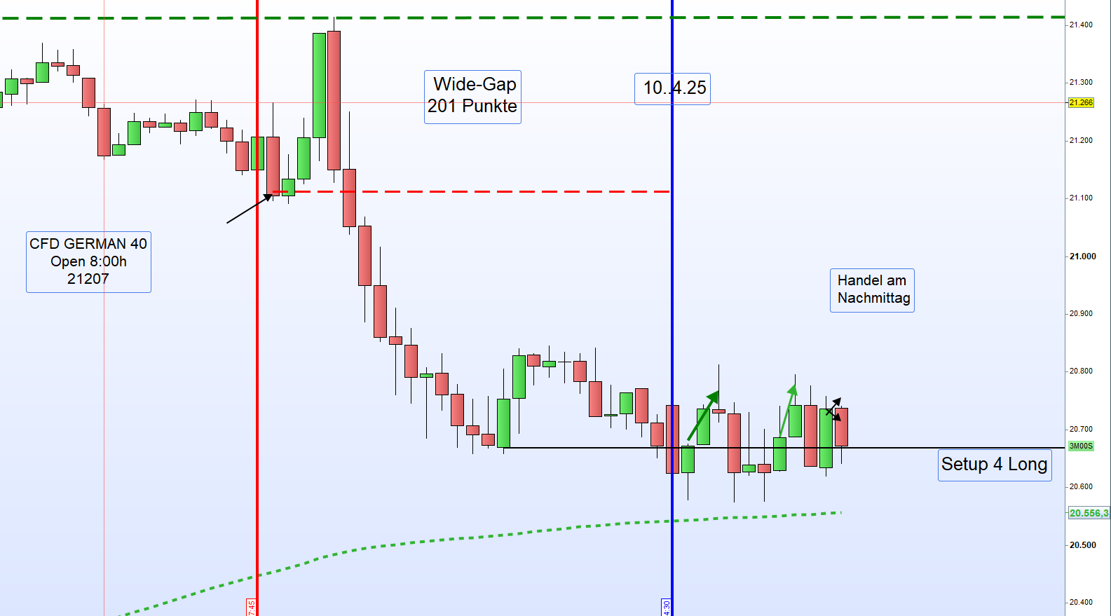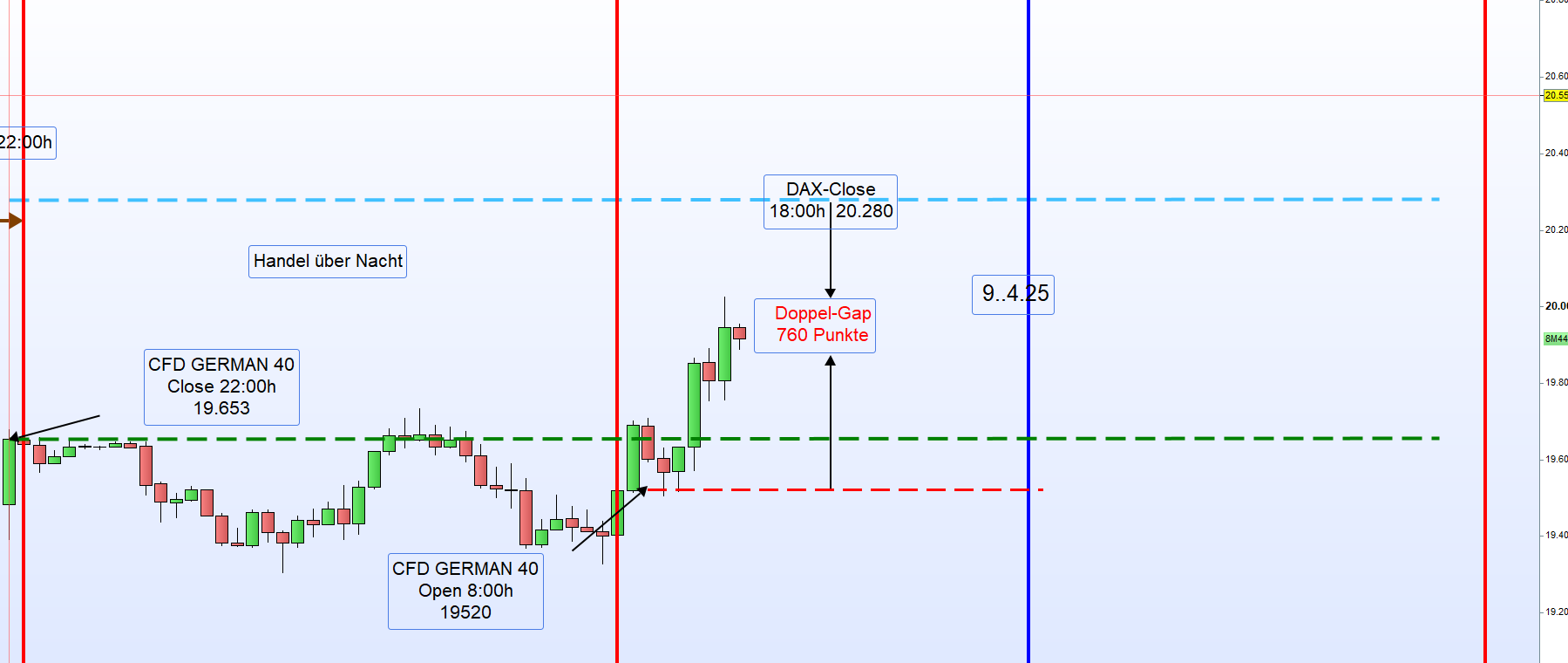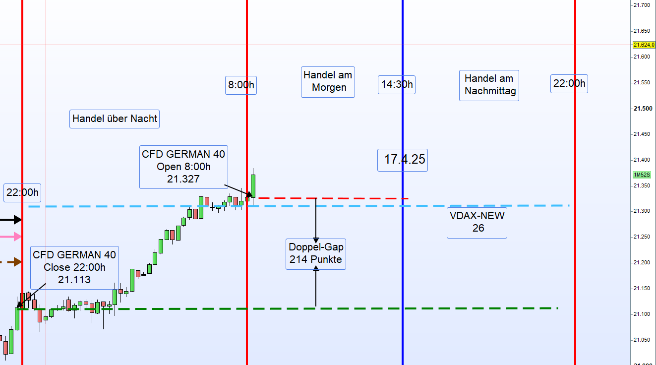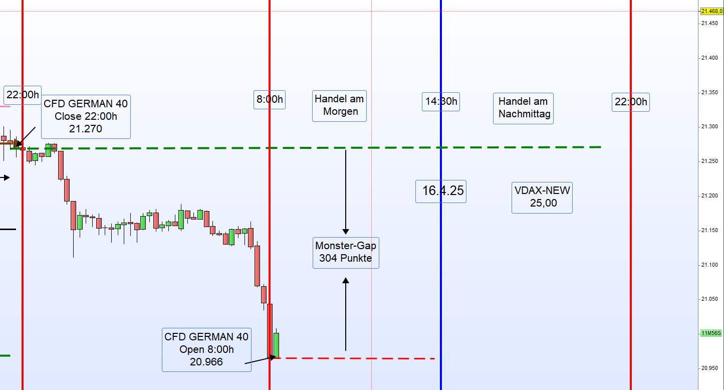 Heute am Sonntag liegen uns bereits einige relevante Daten zur Vorbereitung auf den morgigen Handelsstart vor:- Schlusskurs des German 40 (CFD) am Freitag, 11. April um 22:00 Uhr: 20.696 Punkte- DAX XETRA-Schlusskurs am Freitag um 18:00 Uhr: 20.374 Punkte- Vorläufiges Gap: +322 Punkte- VDAX-NEW-Notierung zum Wochenschluss: 35,98 (hohe Volatilität)Die entscheidende Unbekannte für den morgigen Handelsstart ist der Eröffnungskurs am Montag um 8:00 Uhr, wenn der German 40 offiziell in den Handel geht.