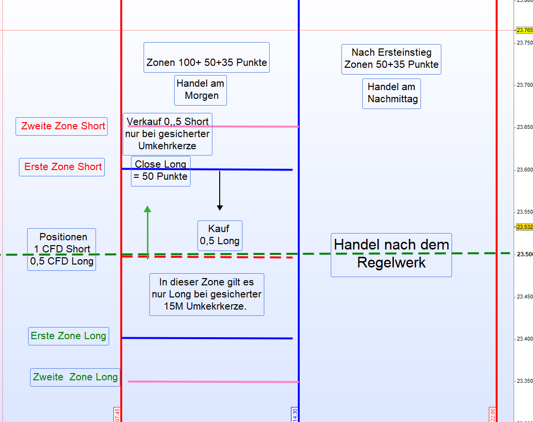 4. Beispiel: Short-Trade aus der ersten AktionszoneDer Einstieg für die Short-Position an der ersten Aktionszone Short ist gemäß dem Regelwerk heute 100 Punkte über dem Schlusskurs vom Freitag um 22 Uhr bei 23.110 Punkten situiert. Dies entspricht einem Niveau von 23.210 Punkten – also bemerkenswerte 162 Punkte über dem heutigen Eröffnungskurs um 8 Uhr. Es ist erstaunlich, dass der German 40 / DAX so stark anstieg, obwohl zur gleichen Zeit die wichtigsten US-Märkte (Majors) tief im Minus notierten.