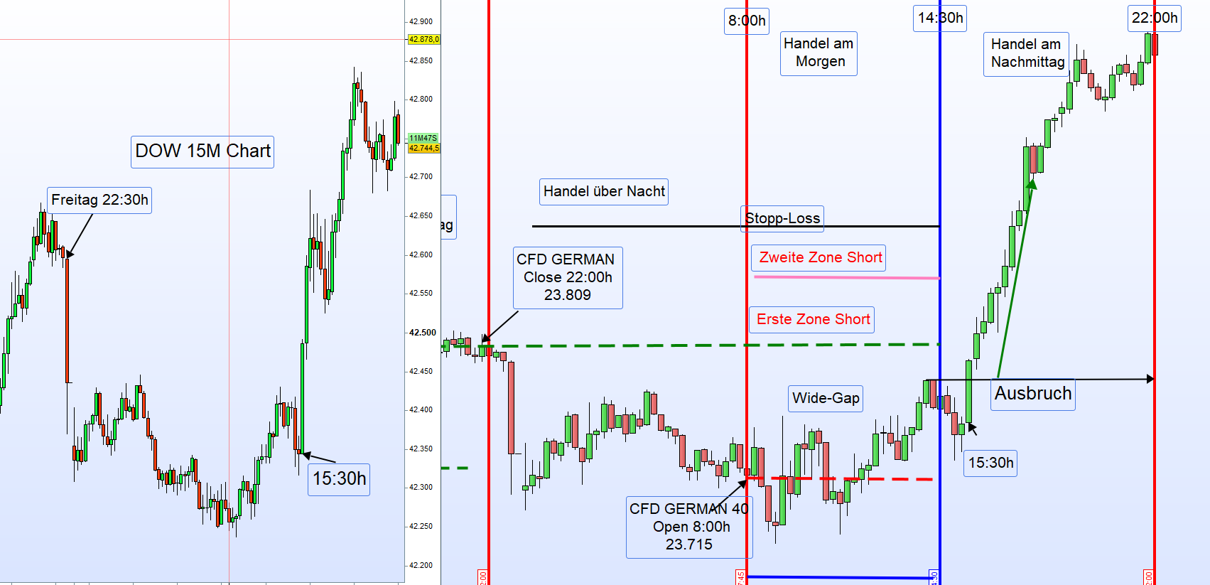Mit der Eröffnung der US-Börse schnellte der Dow deutlich nach oben, und für den DAX/German 40 bot sich die Gelegenheit, den Long-Ausbruch aus der engen Range zu handeln. -
