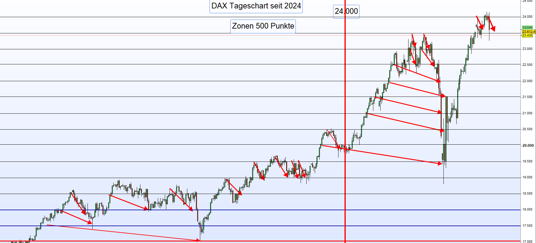 In der Historie wurde nach jedem Anstieg um 1.000 Punkte regelmäßig eine Korrektur verzeichnet. Heute betrachten wir die Korrekturen nach neuen Hochs von jeweils 500 Punkten – seit Beginn des Jahres 2024. Bemerkenswert dabei: In diesem Zeitraum kam es insgesamt 22 Mal zu einer Korrektur von 500 Punkten – zum Teil mehrfach von derselben Kursebene aus, etwa von 24.000 zurück auf 23.500 Punkte. -