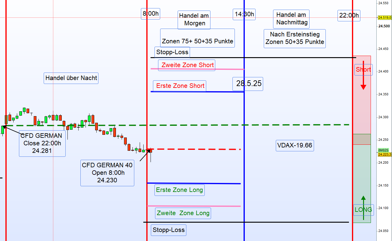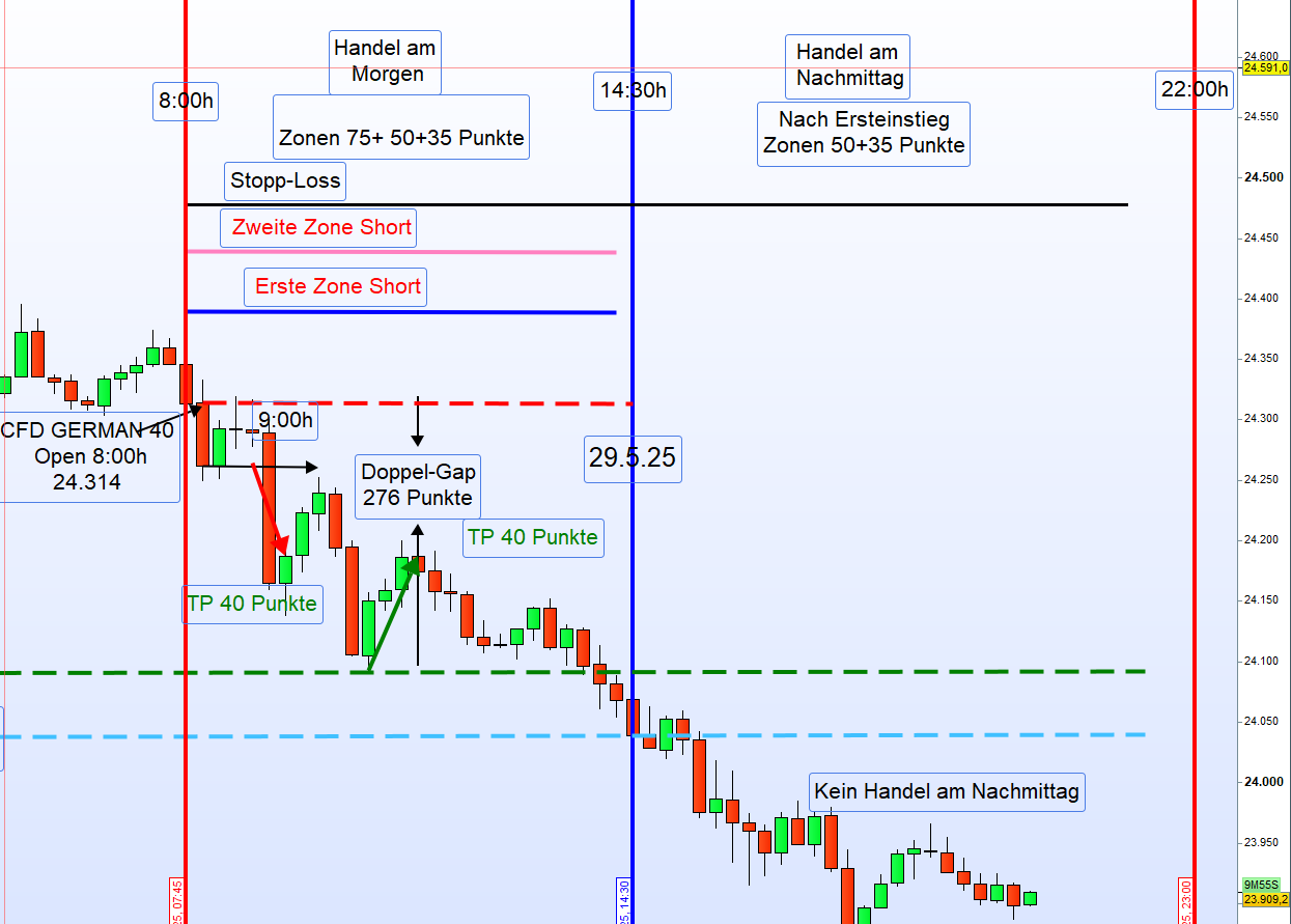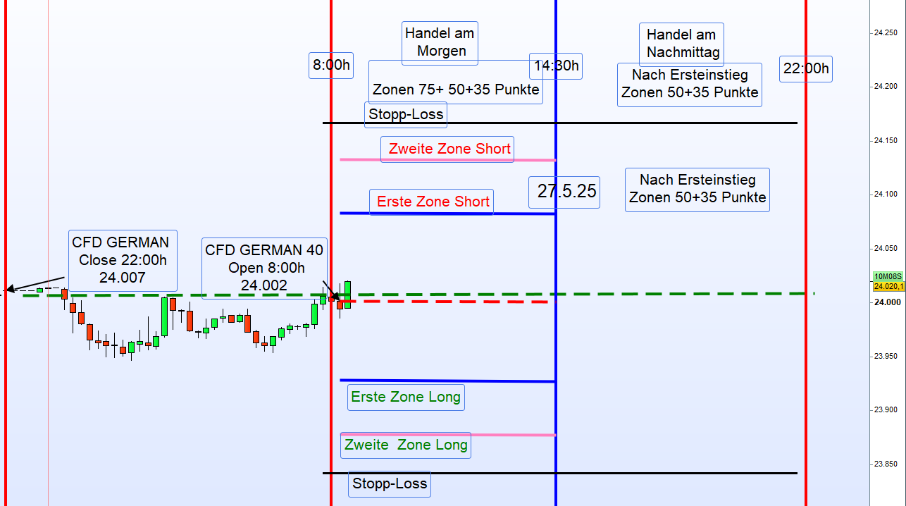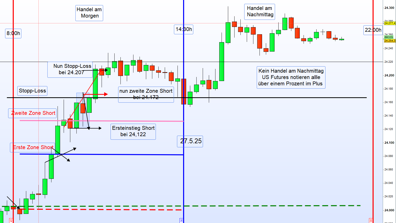 Bearish: Einstieg Short über dem Eröffnungskurs oder bei einem Ausbruch unter das Tief zwischen 8:00–9:00 Uhr.