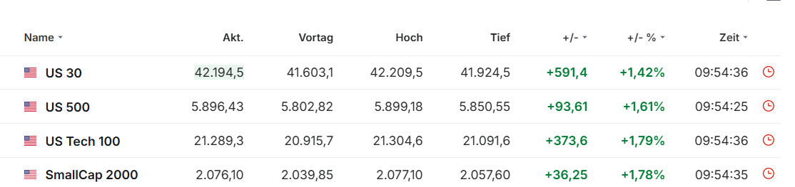 Am heutigen Morgen notierten jedoch alle drei großen US-Indizes (Dow Jones, Nasdaq 100, S&P 500) über 1 % im Plus – als Fortsetzung der Entwicklung vom Freitag.