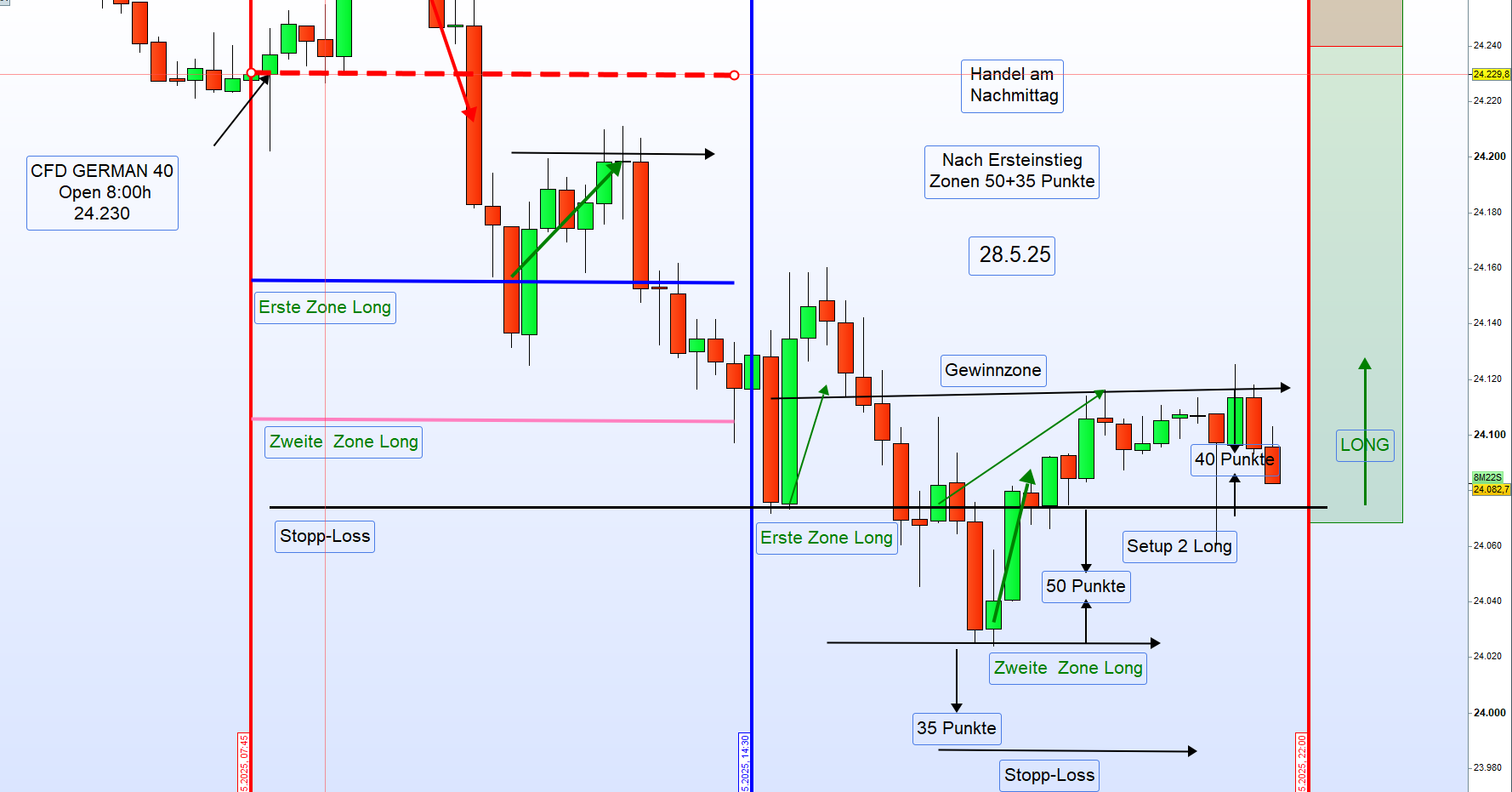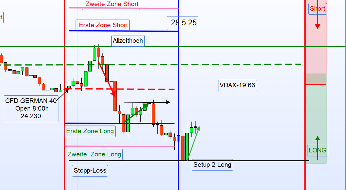 Bullish: Einstieg Long unter dem Eröffnungskurs oder bei einem Ausbruch über das Hoch zwischen 8:00–9:00 Uhr.