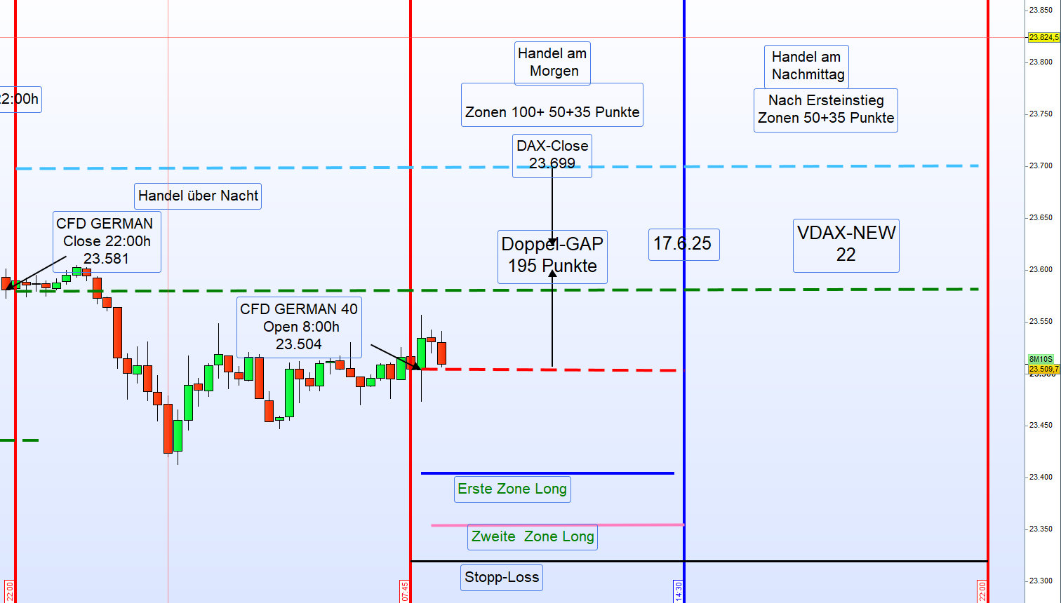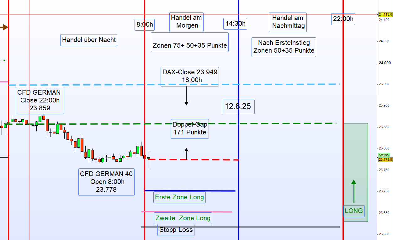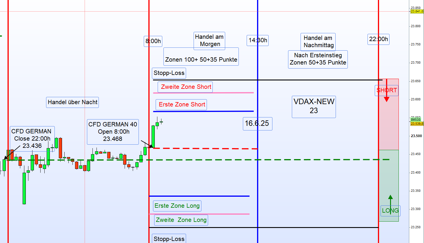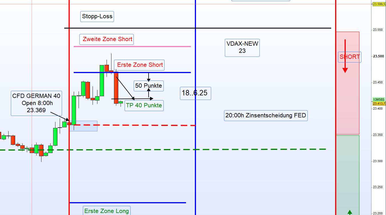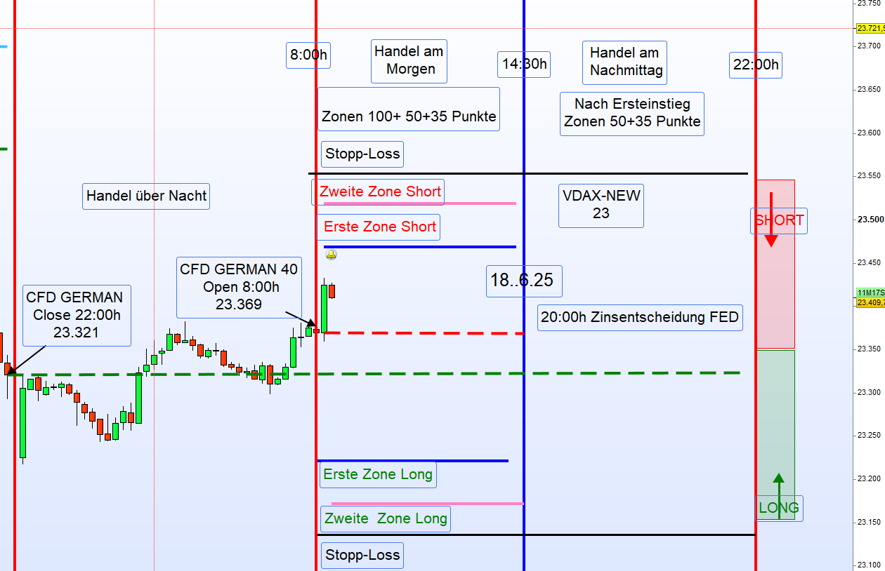 Handel beginnt ab 9:00 Uhr (XETRA-DAX-Eröffnung).Einstieg:•Charttechnische Bestätigung erforderlich:oBullish: Einstieg Long unter dem Eröffnungskurs oder bei einem Ausbruch über das Hoch zwischen 8:00–9:00 Uhr.oBearish: Einstieg Short über dem Eröffnungskurs oder bei einem Ausbruch unter das Tief zwischen 8:00–9:00 Uhr.