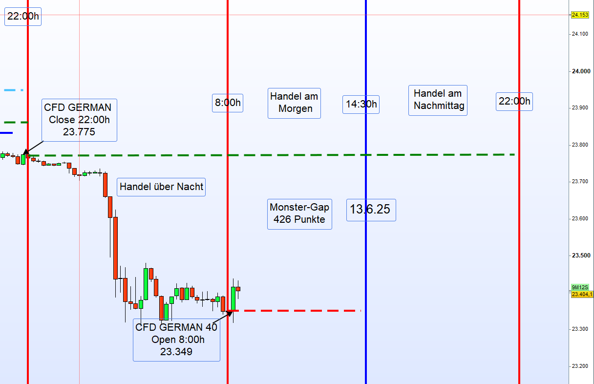 Der DAX CFD (German 40) um 22:00 Uhr mindestens 20 Punkte unter dem Schlusskurs des Xetra-DAX von 18:00 Uhr notiert.