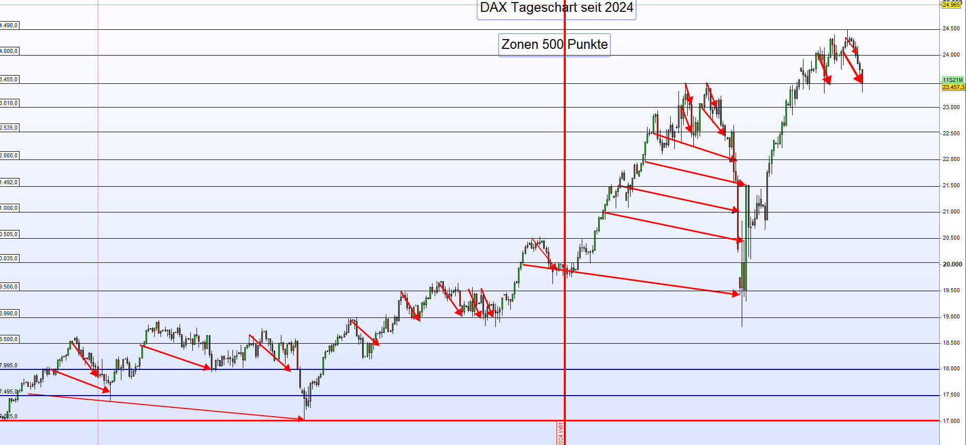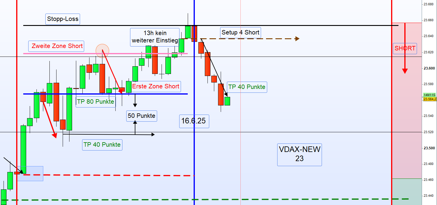 Wurden an der ersten und zweiten Zone, Short oder Long, Positionen eröffnet und nur die Positionen aus der zweiten Zone mit Gewinn glattgestellt, dann wird nach einem Retracement (Rückkehrbewegung) bis zur zweiten Zone dort keine neue Position eröffnet. Zuerst muss die Position aus der ersten Zone abgewickelt werden. Ausnahme wenn der VDAX-NEW um und unter 15 notiert.