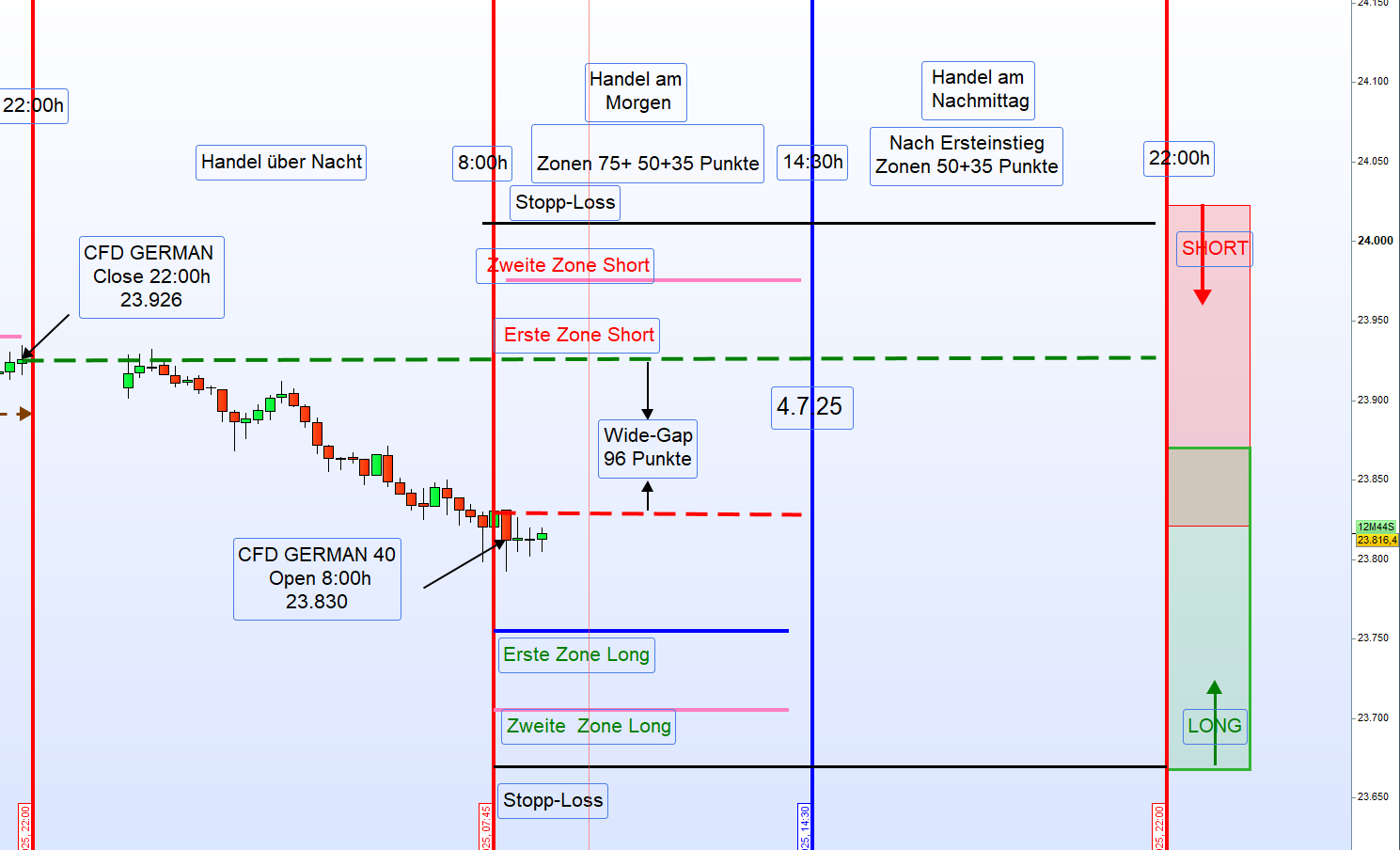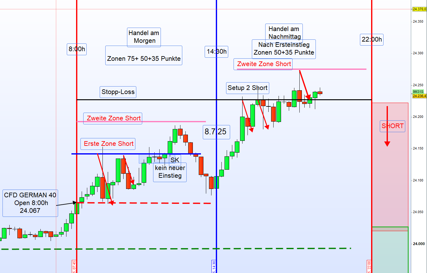 Handelstag: 03.07.2025 – German 40 / DAXDa der morgige 4. Juli (Unabhängigkeitstag USA) ein Feiertag ist, wurde der monatliche US-Arbeitsmarktbericht (NFP) auf den heutigen Tag vorgezogen. Dies erforderte ein angepasstes Trade Management: