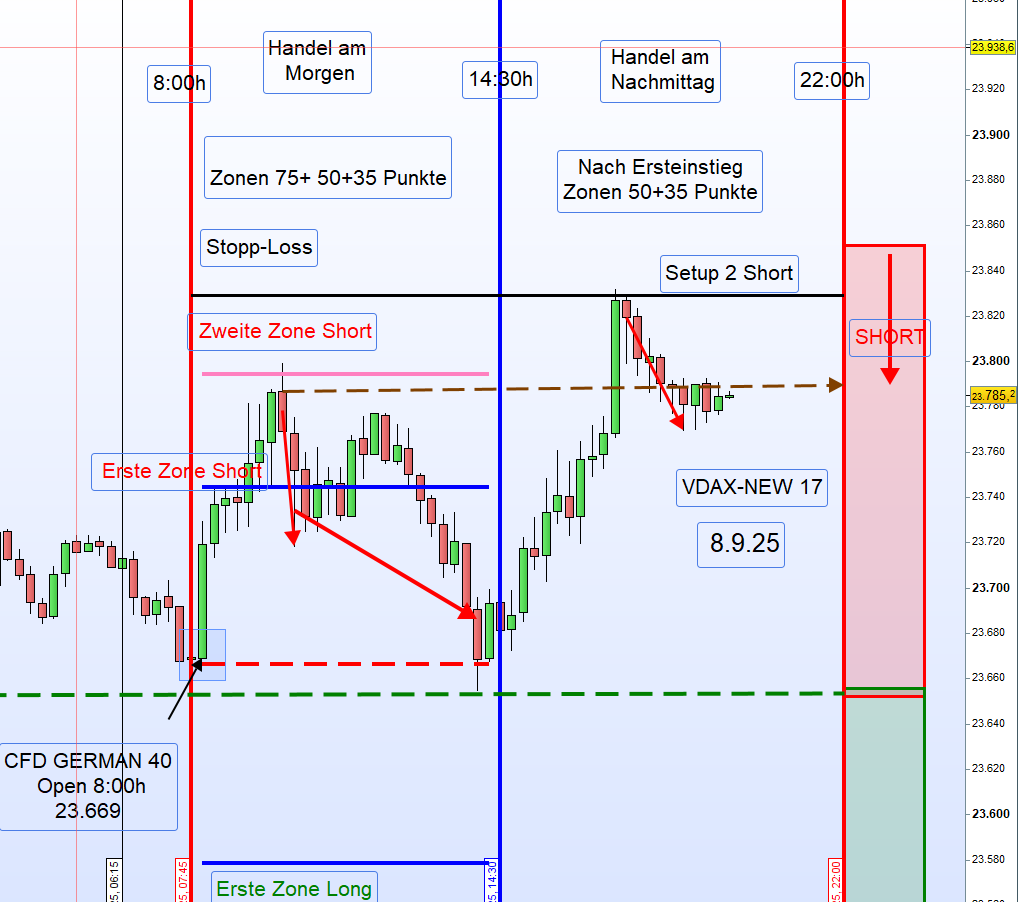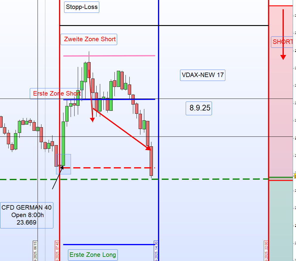 Zwischen 8:00 und 9:00 Uhr wurde der Eröffnungskurs nicht unterschritten. Regelbasiert hätte daher ein Short-Einstieg an der ersten Zone erfolgen müssen, sofern der Kurs von oben auf die Aktionslinie trifft und eine 15M-Kerze darunter schließt. Dies war jedoch nicht der Fall.