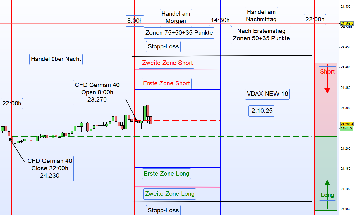 Die Long-Position werde ich nun zunächst als Joker handeln. Dabei dokumentiere ich für mich fortlaufend, welche weiteren Joker ich unterhalb von 24.400, eventuell zwischen 24.400 und 24.500, und gegebenenfalls auch darüber eröffne. Darüber präferiere ich Short-Positionen am Nachmittag. Weitere Joker werde ich jeweils gemäß meiner Trading-Strategie handeln.