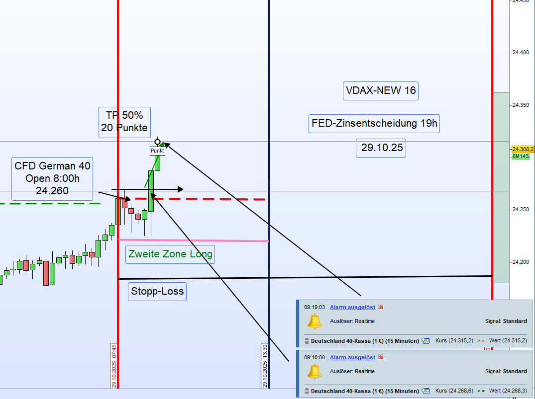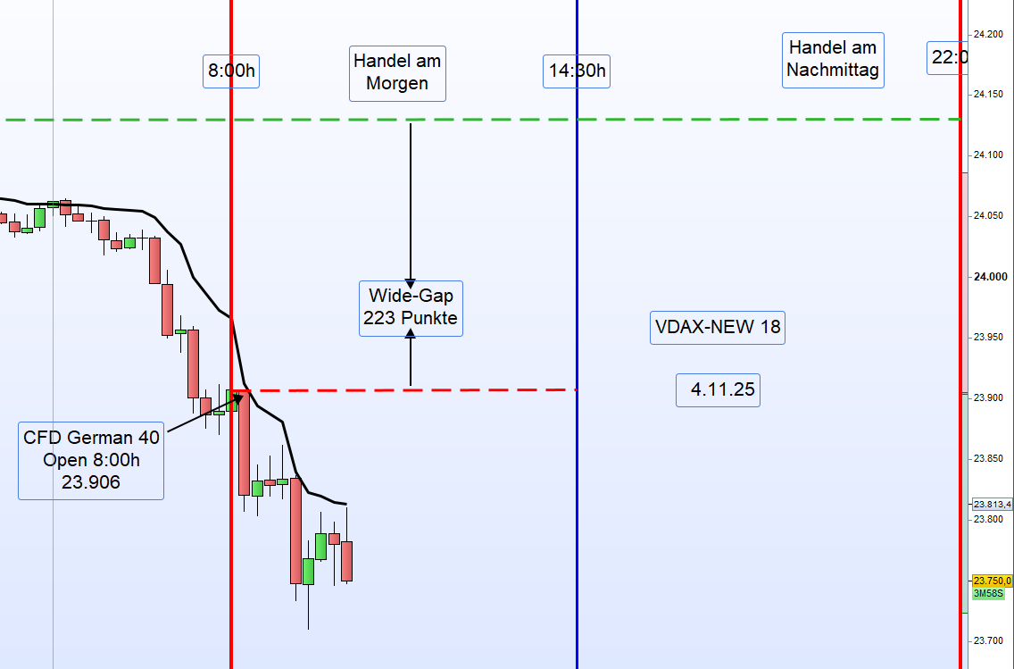 Handelstag 4.11.2025 – German 40Einleitung:Der German 40 schloss am Vortag (3.11.2025) um 22:00 Uhr mit 24 129 Punkten.Heute Morgen, am 4.11.2025 um 8:00 Uhr, eröffnete der Markt bei 23 906 Punkten,was einem starken Down-Gap von 223 Punkten entspricht.Auch die US-CFDs notieren deutlich im Minus,insbesondere der Tech-Index Nasdaq mit einem Rückgang von 1,36 %.Nach der Eröffnung ist der German 40 zunächst um weitere 100 Punkte gefallen.Eine Einteilung der Long-Zonen ist derzeit nicht möglich.Die DAX-Eröffnung um 9:00 Uhr könnte neue Erkenntnisse für einen möglichen Long-Einstieg liefern.⚠️ Handelsempfehlung➡️ ENTHALTUNGBis zur DAX-Eröffnung um 9:00 Uhr keine Long- oder Short-Positionierung. ReferenzkurseZeitpunkt Beschreibung Kurs22:00 (3.11.) Schlusskurs German 40 24 12908:00 (4.11.) Eröffnung German 40 23 906➡️ Down-Gap: −223 Punkte➡️ US-Futures: stark im Minus➡️ Nasdaq: −1,36 %➡️ Marktlage: volatil, abwartend
