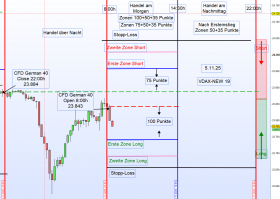 Handelstag 4.11.2025 – German 40Einleitung:Der German 40 schloss am Vortag (3.11.2025) um 22:00 Uhr mit 24 129 Punkten.Heute Morgen, am 4.11.2025 um 8:00 Uhr, eröffnete der Markt bei 23 906 Punkten,was einem starken Down-Gap von 223 Punkten entspricht.Auch die US-CFDs notieren deutlich im Minus,insbesondere der Tech-Index Nasdaq mit einem Rückgang von 1,36 %.Nach der Eröffnung ist der German 40 zunächst um weitere 100 Punkte gefallen.Eine Einteilung der Long-Zonen ist derzeit nicht möglich.Die DAX-Eröffnung um 9:00 Uhr könnte neue Erkenntnisse für einen möglichen Long-Einstieg liefern.⚠️ Handelsempfehlung➡️ ENTHALTUNGBis zur DAX-Eröffnung um 9:00 Uhr keine Long- oder Short-Positionierung. ReferenzkurseZeitpunkt Beschreibung Kurs22:00 (3.11.) Schlusskurs German 40 24 12908:00 (4.11.) Eröffnung German 40 23 906➡️ Down-Gap: −223 Punkte➡️ US-Futures: stark im Minus➡️ Nasdaq: −1,36 %➡️ Marktlage: volatil, abwartend