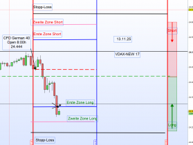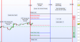 Beim Zonenhandel ergeben sich die Zonenweiten von entweder 100 oder 75 Punkten Abstand vom Eröffnungskurs um 8:00 Uhr sowie vom Schlusskurs des Vortags um 22:00 Uhr auf Basis von Wahrscheinlichkeiten und in Abhängigkeit von den aktuellen DAX- und VDAX-Notierungen. Mitunter liegt die Berechnung genau zwischen beiden Varianten, sodass sowohl 100 als auch 75 Punkte möglich wären. Diese Situation wird als Borderline bezeichnet.ZusatzbemerkungEs ist daher möglich, wie im angehängten Chart ersichtlich, eine zusätzliche Zone ober- oder unterhalb der ersten Zone mit 25 Punkten Abstand zu markieren. Notiert der Kurs in dieser zur Aktionslinie vorgelagerten Zone, kann ein erfahrener Trader dort nach dem Erscheinen einer eindeutigen Umkehrkerze Long- oder Short-Positionen eröffnen. Diese Ergänzung erlaubt eine feinere Abstimmung potenzieller Einstiege, besonders in Phasen erhöhter Unsicherheit hinsichtlich der Zonenweite. -