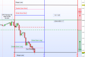 Die Analyse der letzten 30 Handelstage seit dem 1.10.2025 bis zum 7.11.2025 zeigt, dass die grüne Umkehrkerze an der ersten Long-Zone ein wesentlicher Auslöser für präzise Einstiege ist. Berücksichtigt wurden dabei auch die ersten Zonen nach erfolgter Zonenanpassung. Zusätzlich galt die Regel, ab 13 Uhr keine neuen Positionen mehr zu eröffnen. Der VDAX notierte in diesem Zeitraum immer unter 20, außer am 7.11.2025.