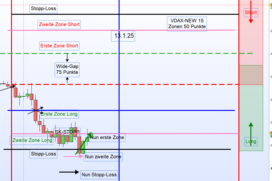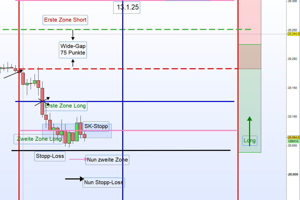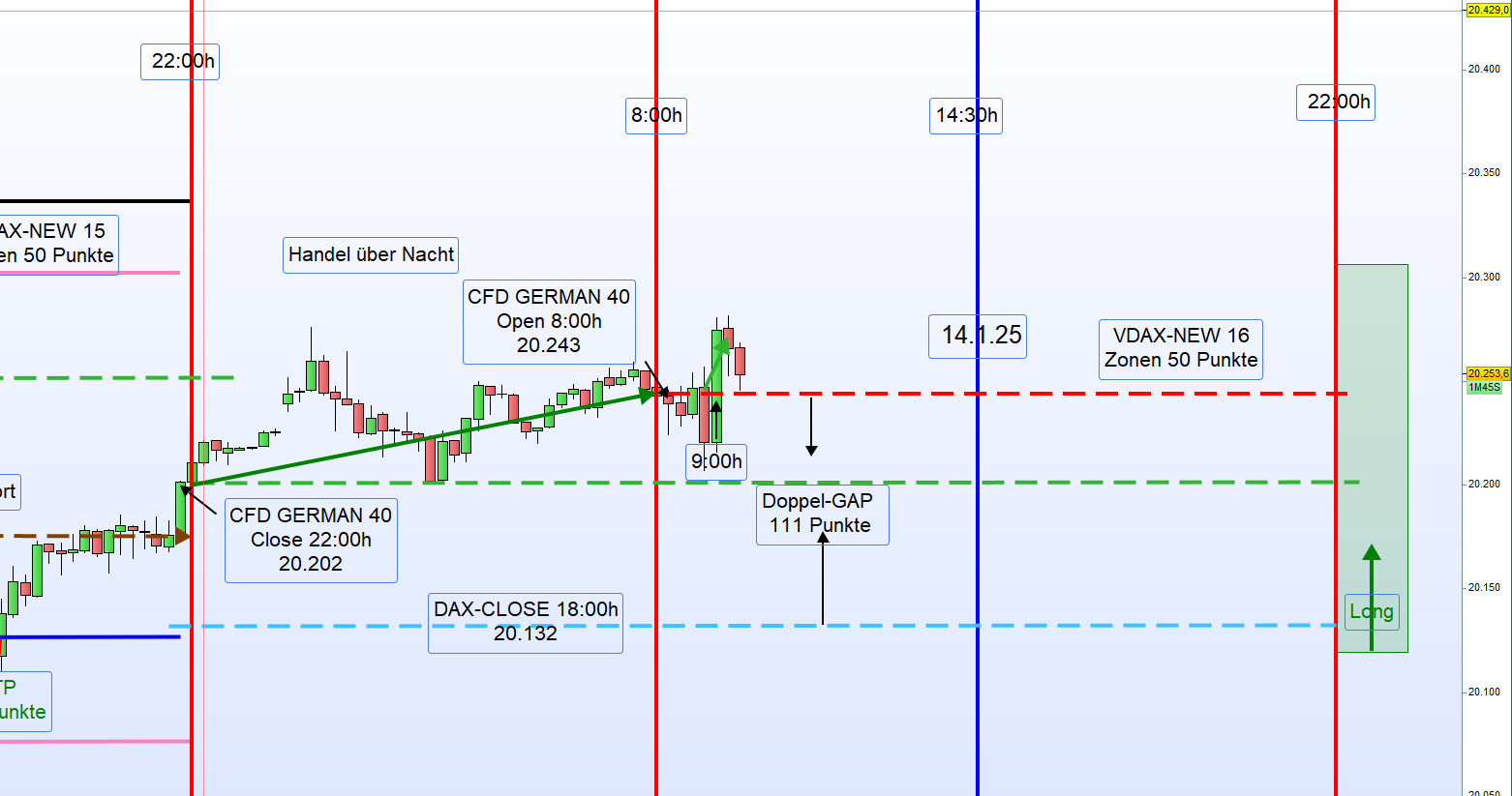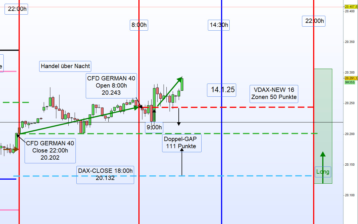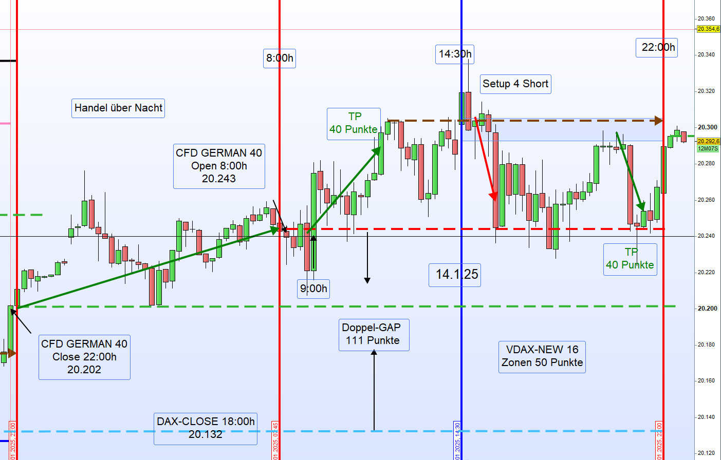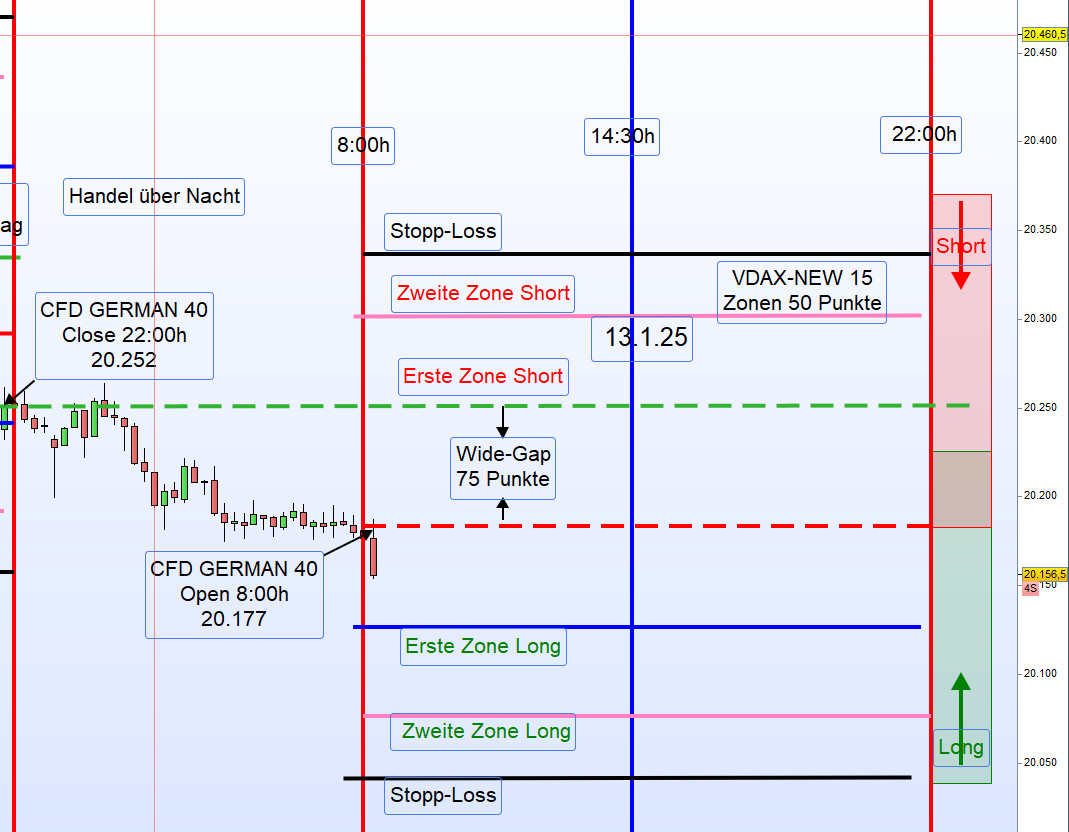 Zusammenfassung Handelstag 14. Januar 2025Das Regelwerk für den Handel definiert präzise die Bedingungen, unter denen Kurslücken (Gaps) berücksichtigt werden. Kurslücken entstehen in folgenden Fällen: