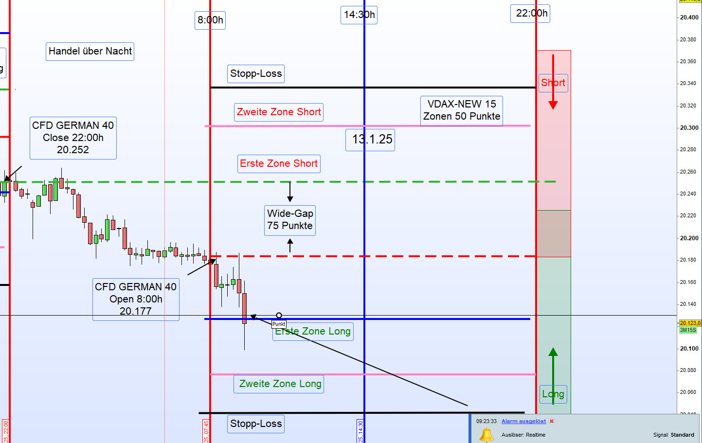 Wird eine solche Bewegung beobachtet, kann mit einer Fortsetzung der Kurslücke gerechnet werden. Um mögliche Risiken durch Marktschwankungen zu minimieren, wird der Handel jedoch aus Sicherheitsgründen erst ab der offiziellen Eröffnung des DAX um 9:00 Uhr aufgenommen. Dieses Vorgehen stellt sicher, dass potenzielle Kursbewegungen während der Eröffnungsphase berücksichtigt werden, ohne dabei unnötige Risiken einzugehen.