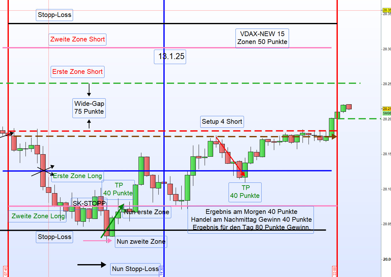 Nachmittag: Vom morgendlichen Tageshoch wurde das Setup Short gehandelt, und dies zweimal erfolgreich mit jeweils 40 Punkten Ertrag.