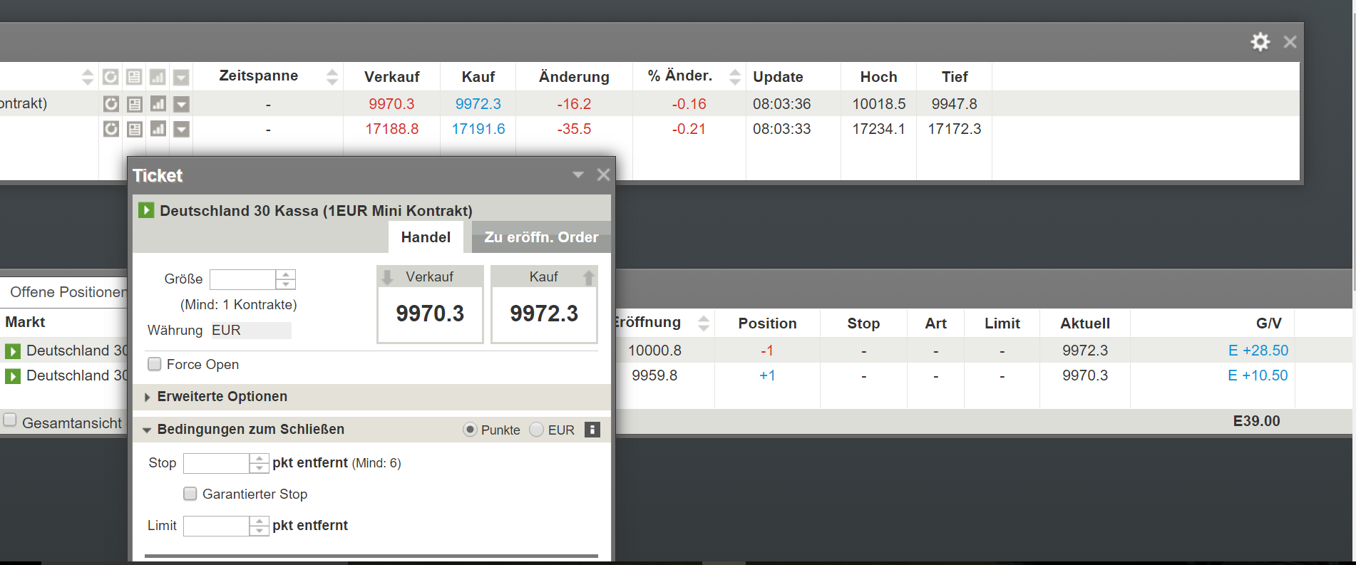 Mein heutiger Handel mit CFDs war ziemlich erfolgreich. Zunächst kleine Gewinnmitnahmen an der ersten Shortzone und dann eine punktgenaue Positionseröffnung leicht oberhalb der zweiten Shortzone. Je nach Umfeld, von den Rändern der Range werden die sichersten Gewinne erzielt, steige ich mit drei Positionen oder vielfach ein. Heute waren es drei CFDs . Nach Einstieg erfolgt, sofern möglich, Gewinnmitnahmen von ein und zwei Positionen und die dritte darf nach Möglichkeit weiterlaufen. Dies ist