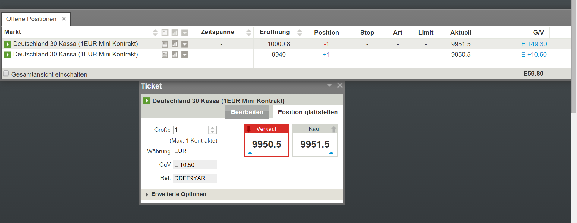 Aus dem Chart ist zu ersehen, dass bei 10.000 eine Mini-Shortposition eroffnet wurde und zwar im Zusammenhang meiner speziellen