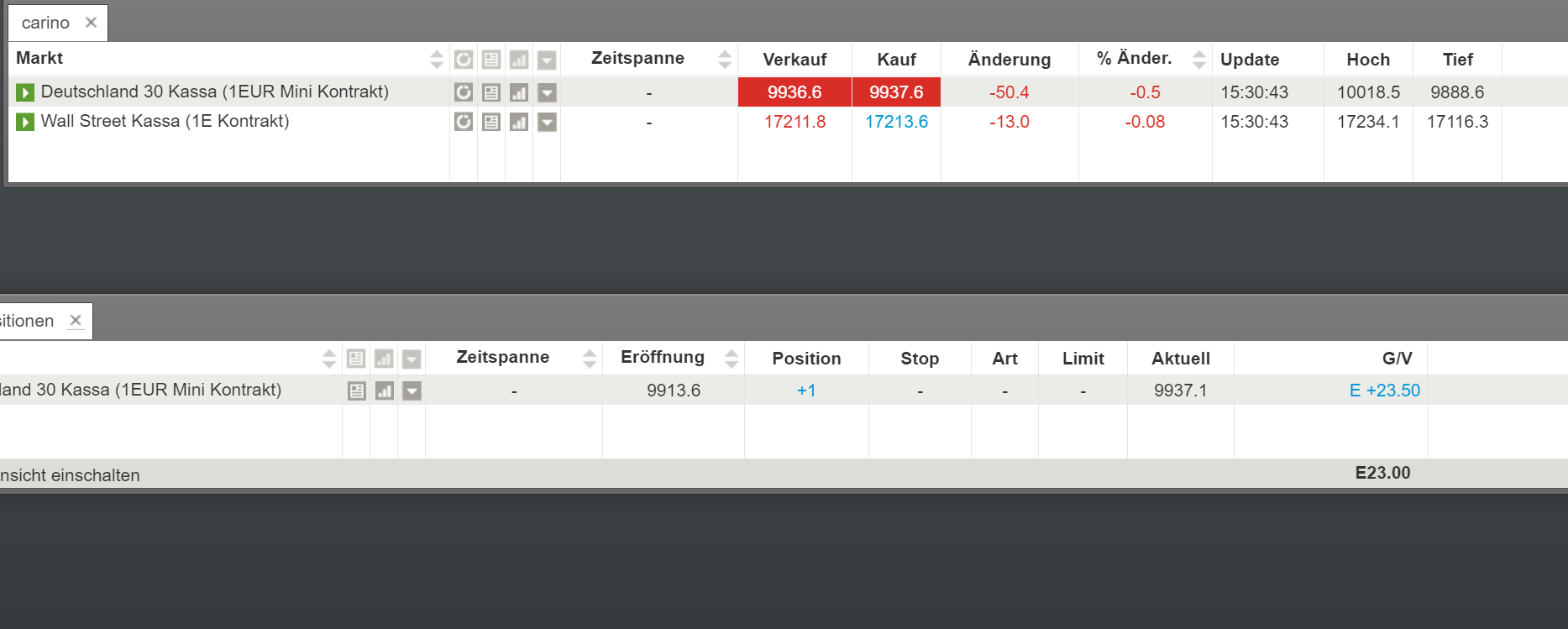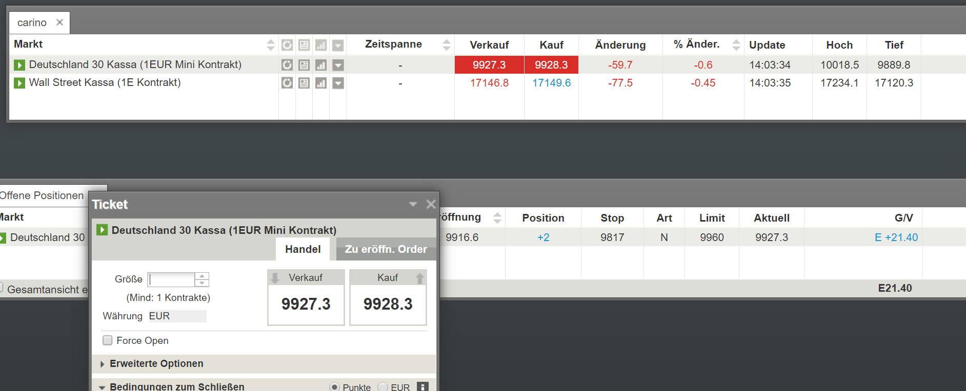 Hatte gestern mein Positionsmanagement geschildert und möchte heute die Positionseröffnung und Gewinnmitnahmen dokumentieren. Einstieg mit 3 CFD Kontrakten und Gewinnmitnahmen von jeweils einer Teilposition. nach Schließung der Gesamtpositionen wurde nach Kursrückprall aufgrund nachfolgender Abwesenheit nur ein CFD mit take profit an dem Tageshoch eröffnet.