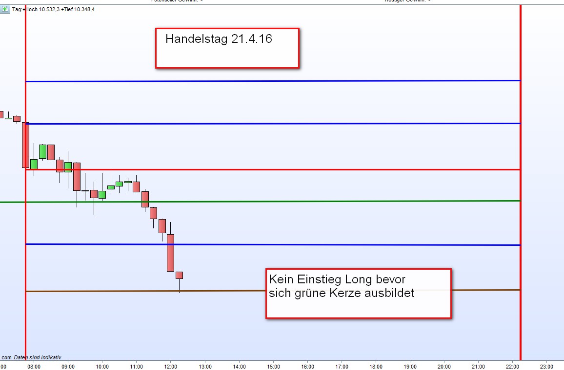 Sobald man feststellt, dass sich der Kurs an einer Zone stabilisiert, heute Long, und davon auszugehen ist, dass er sich aufgrund von anstehenden Nachrichten erholt, sollte man nach dem ersten Einstiegspunkt eine weitere Zone mit dem normalen Abstand nach unten zur Orientierung einzeichnen an der eventuell, nur durch Bestätigung, eine kontraktmäßig höhere Longposition eröffnet wird. Sollte dies eintreten, so muss man auch wirklich einen Stopp Loss für die Gesamtposition einbauen. Dieser hängt vom Kapital ab. Nach dem Einstieg Long an der zweiten Zone, nehmen wir an mit 2 Kontrakten CFDS, werden, sofern möglich, Teilgewinne sehr schnell realisiert denn es ist zu beachten, dass die erste Position Long, wie heute am Schlusskurs, noch im Rennen ist und jede kleinere Gewinnmitnahme den Verlust schmälert. Kehrt der Kurs in die Nähe der zweiten Longzone wieder zurück beginnen wir von vorne. Hatte heute Glück und konnte alleine in dieser Zone viele Punkte machen bevor die erste Longposition wieder in den Gewinn lief.