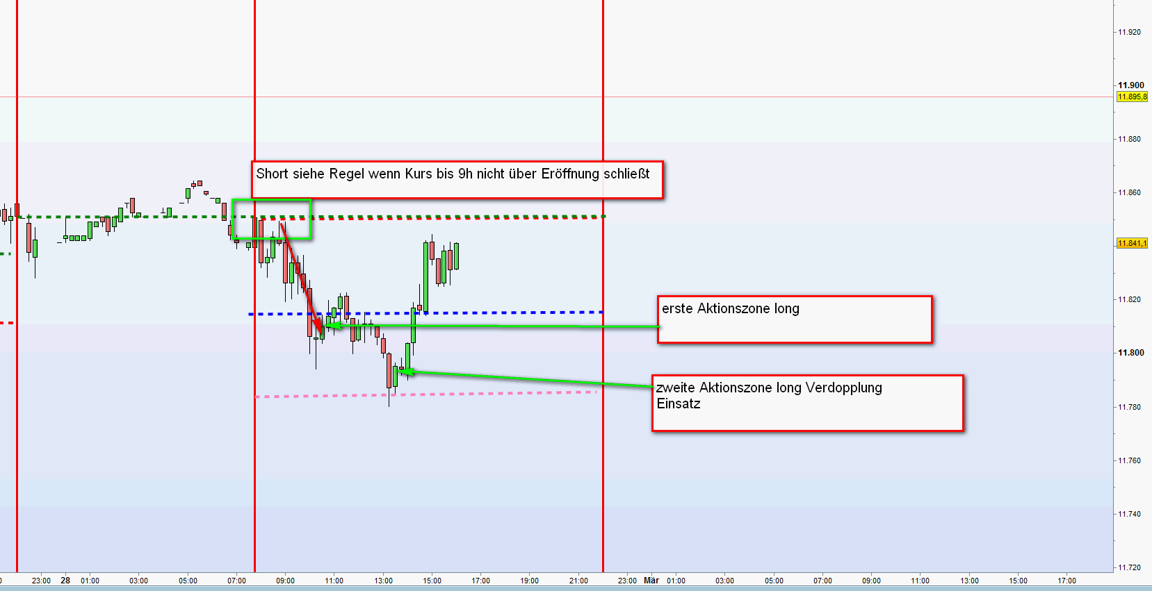 Es handelt sich nun um eine Dauershortstrategie mit Einstieg bei 12000. Blättere zurück und versuche bitte diese Strategie einzuordnen. Die Shortposition bleibt zunächst offen und wir handeln Intraday long oder short gegen oder mit der Shortposition. Aktionszonen mit Aufstockung usw kommen hier nicht zum tragen!