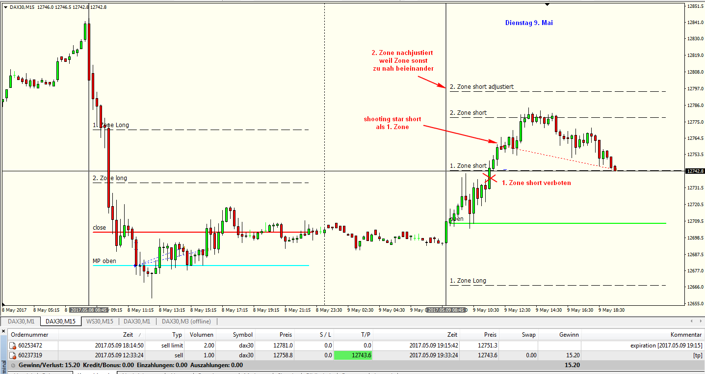 Hallo, sofern sich kein Trendtag abzeichnet, was heute nicht der Fall war, handeln wir in Richtung Mittelkurs (mean). Für unser Lernprogramm erst nach Umkehrkerze. Eines der wichtigsten Aspekte im Trading ist Geduld und Übersicht. Wer dies nicht als Ritual sich zu eigen macht hat keine Chance. Vor allen Dingen bei hoher Vola. -