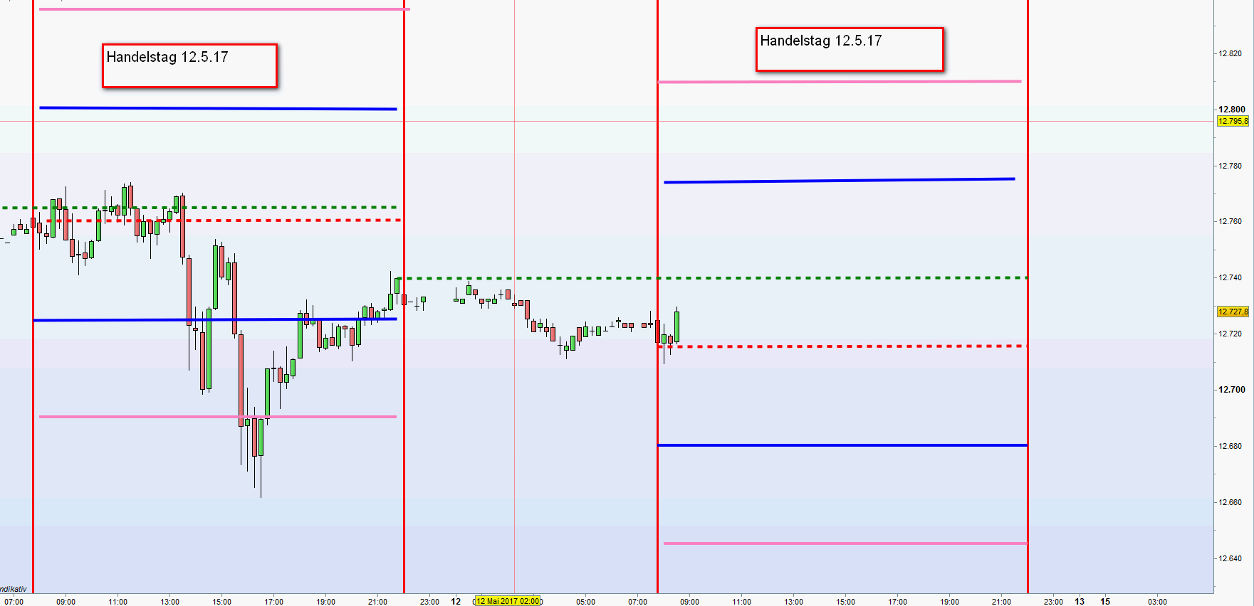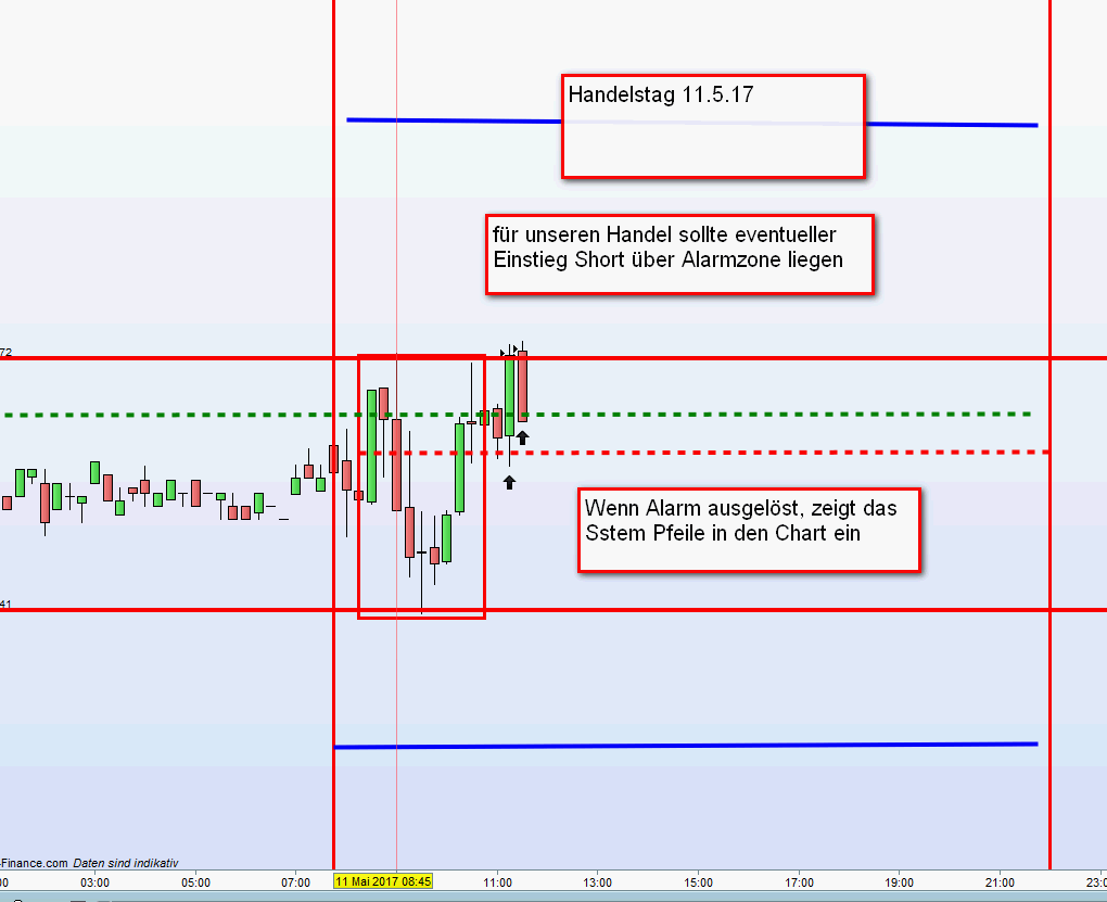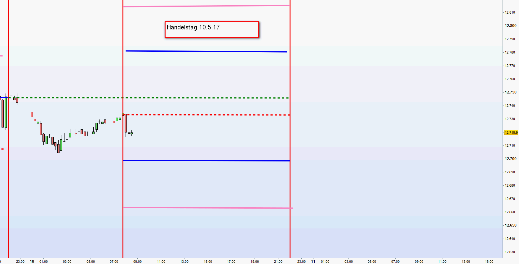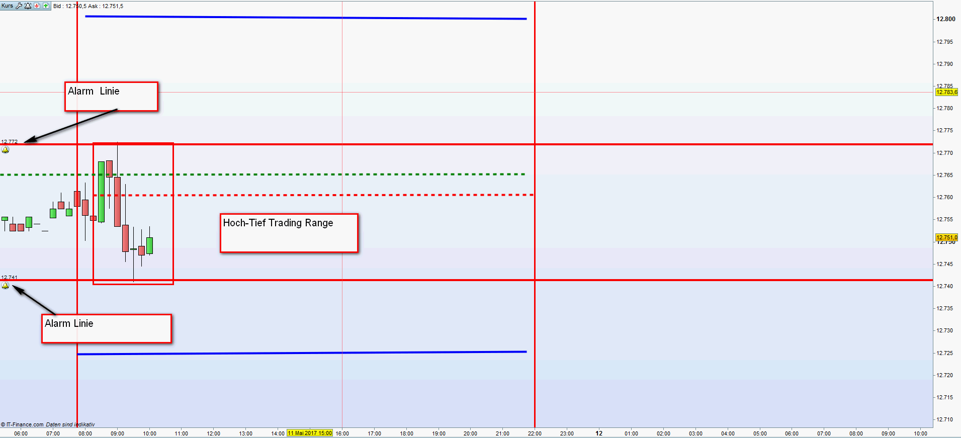 Auch bei enger Trading Range können wir aktiv werden. Im angefügten Chart eingezeichnet bisheriges Hoch und Tief der Handelsspanne. Vertikaler Handel bedeutet, dass wir nicht in der bisherigen Range handeln sondern unter/über der Range. Ständiger Blick auf Chart nicht notwendig indem Alarm aktiviert wird. -