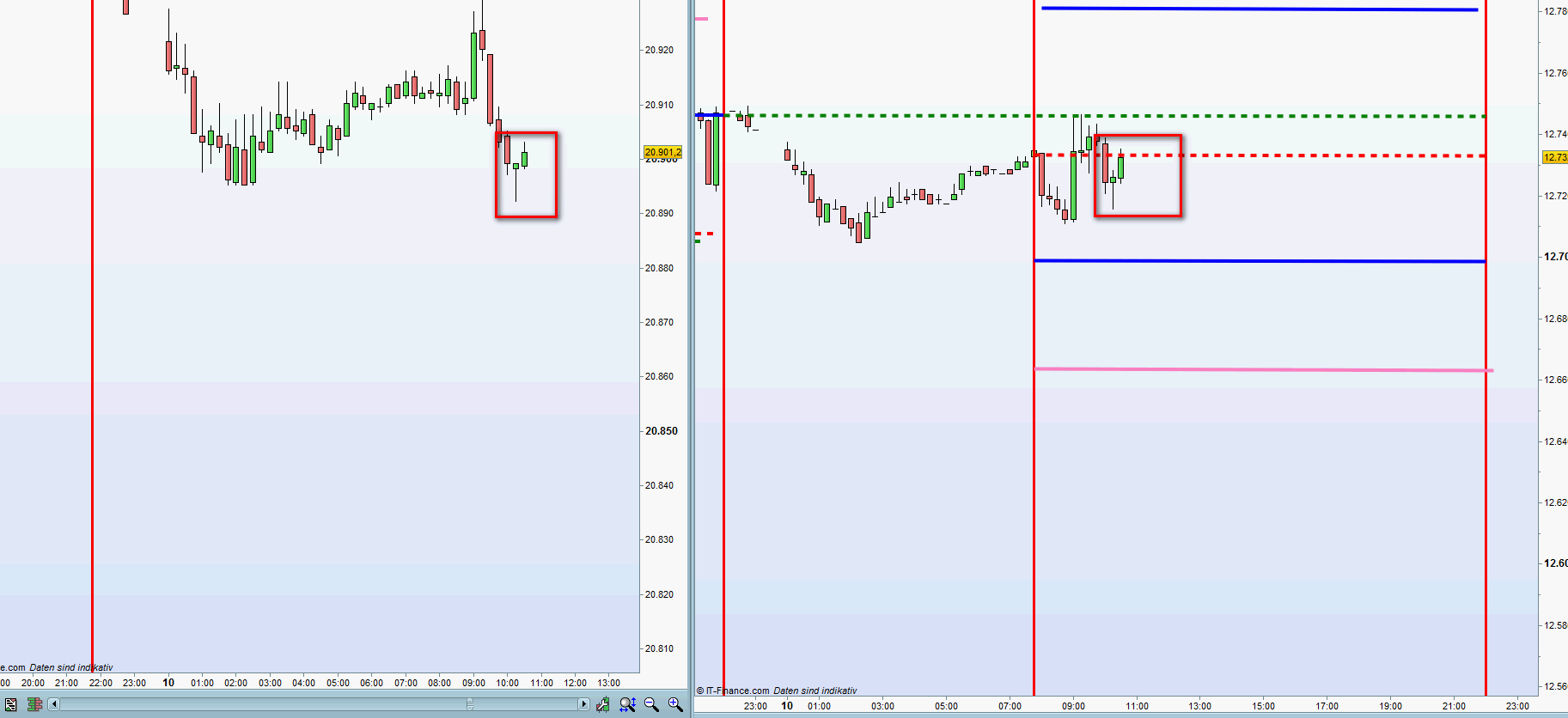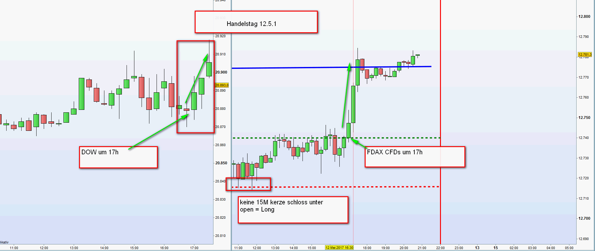 Bezüglich DOW war dies nicht ganz zutreffend jedoch die Wirtschaftdaten von heute Morgen sorgten dafür, dass keine 15M Kerze unter dem Eröffnungskurs um 8h schloss. Ab 17h war DOW Vorgabengeber nach oben. Nach 17:30h bewegt sich dann der FDAX kaum noch.