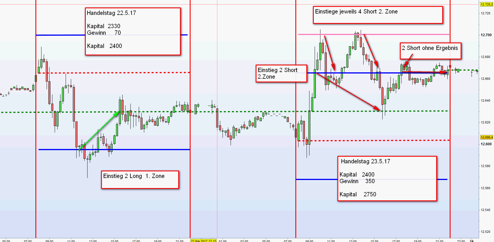 Einstieg mit Stop Orders 2 Kontrakte (CFD German 30) jeweils an der ersten Zonen und 4 an den zweiten Zonen nach Berührung Linie.