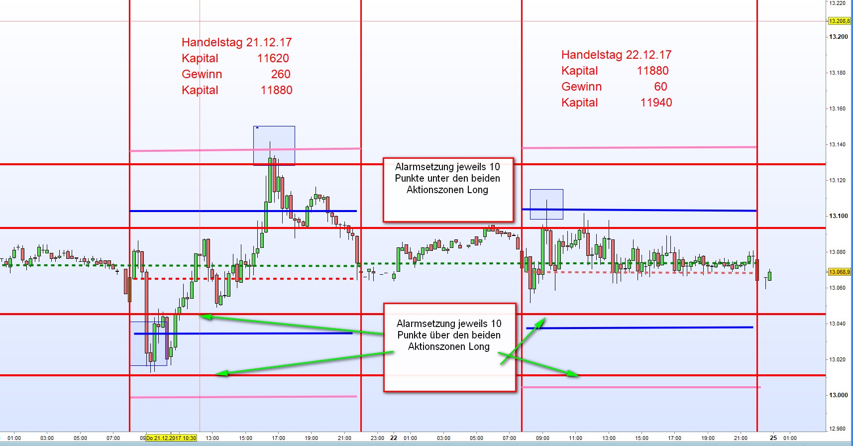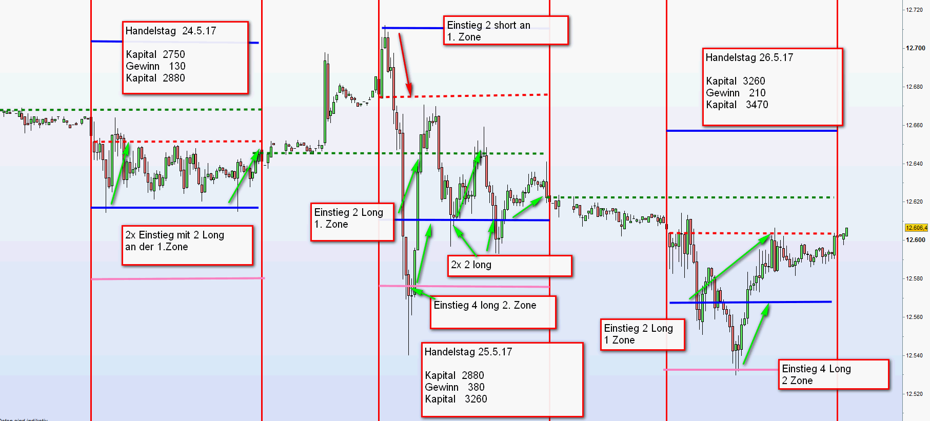 Kursentwicklungen über oder unter den Zonen erst später eröffnet werden. Viele Kurse durchschneiten die Linien. Andererseits kommt es zu einer punktgenauen Berührung der Zonen mit sofortigem reversal zum mean. In den eingefügten Charts, gekennzeichnet mit Vierecken gut ersichtlich. Allerdings gehört zu diesen Ausführungen viel Übung und Geschick.
