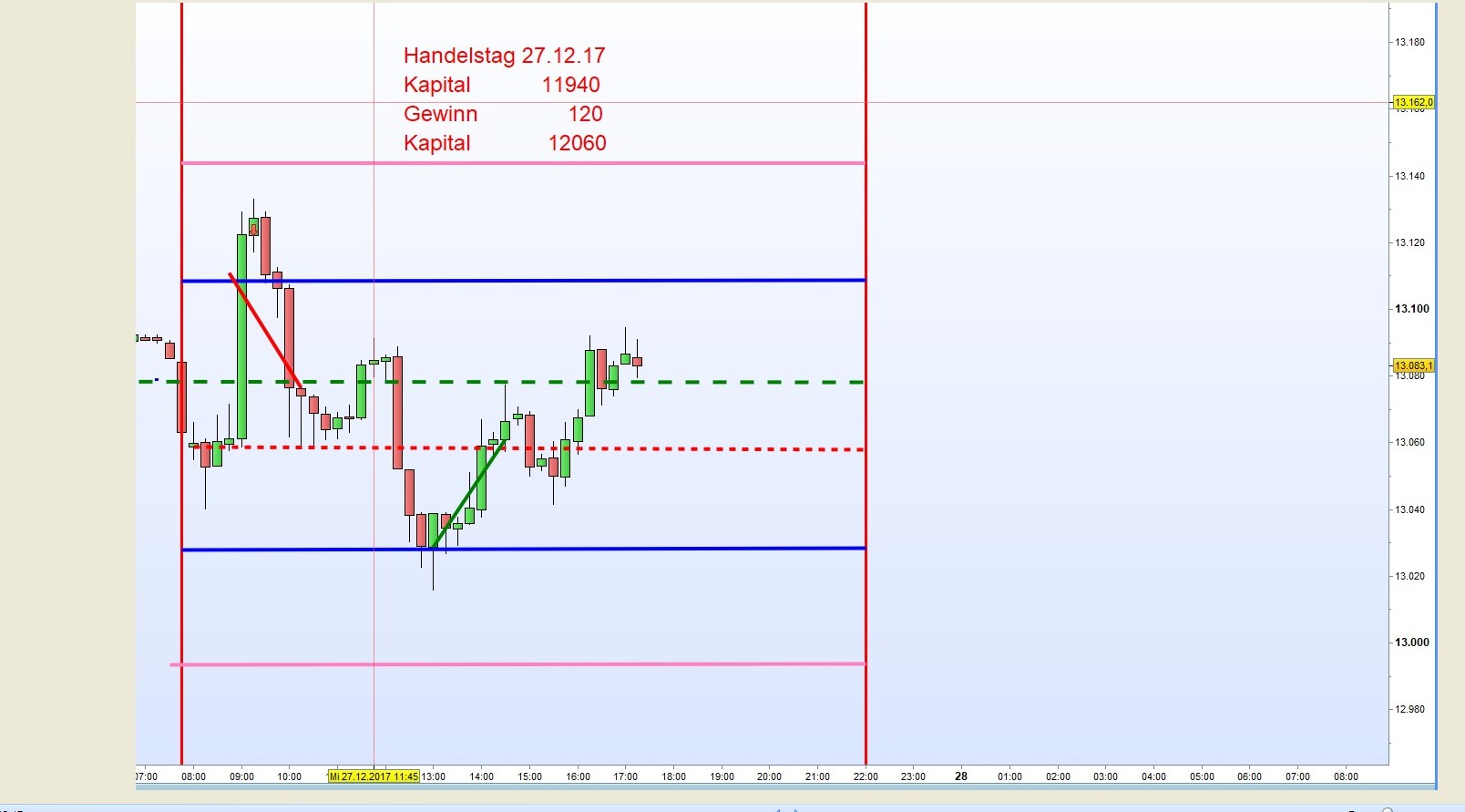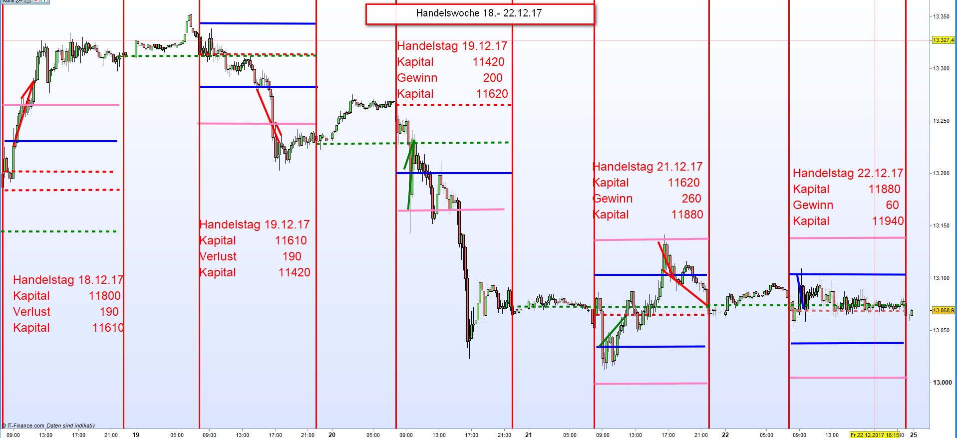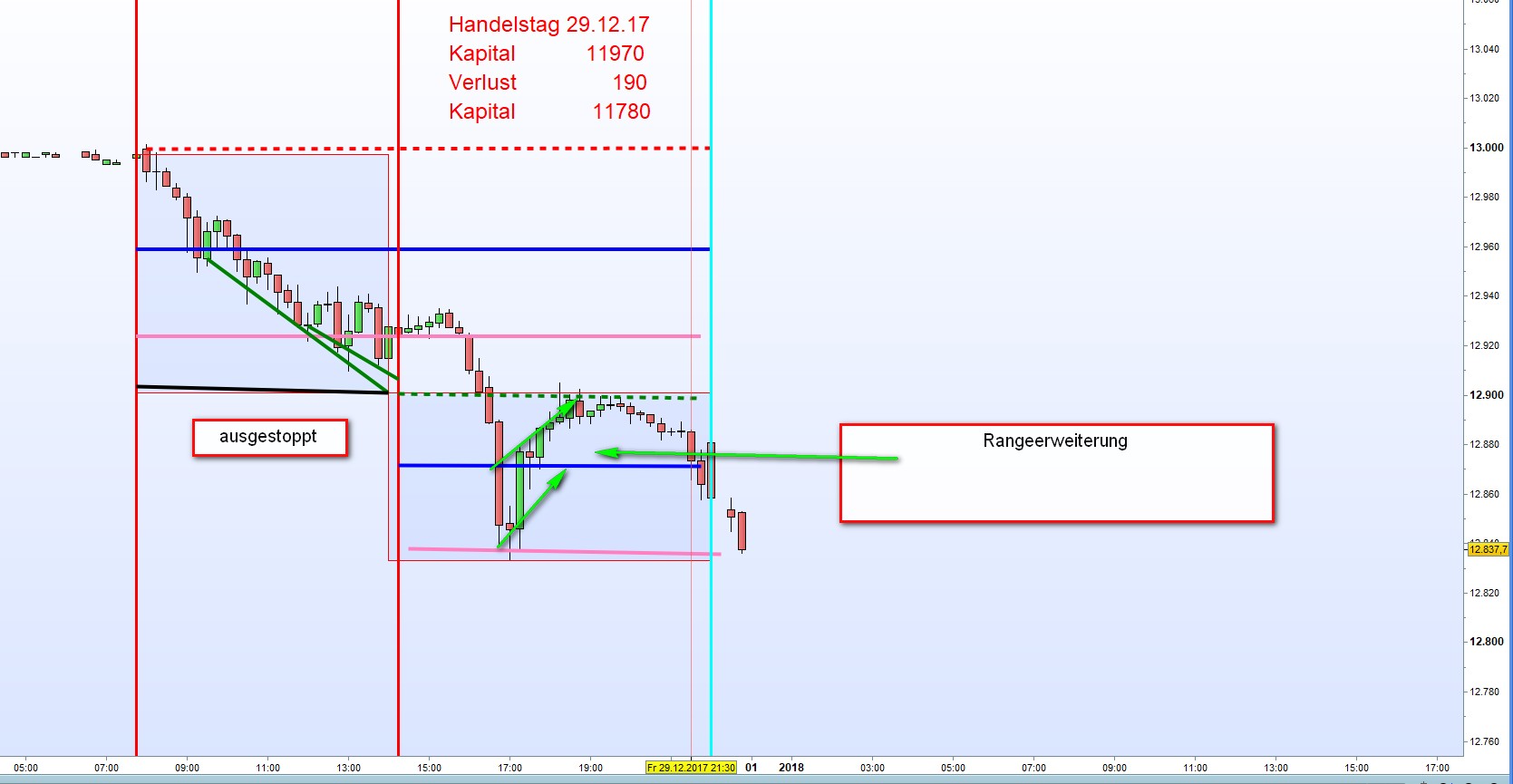 Die im letzten Beitrag Kriterien der FDAX-TRADING-STRATEGIE dargelegte Simulation erbrachte seit dem 1. Januar 2017 mit einem Anfangskapital von 2000 bis heute ein Gesamtergebnis von 9940€ Derzeitiger Kontostand 11940. Der höchste tägliche Kapitaleinsatz war nur 6CFDs mit einer Marginanforderung von ca. 400€. In der gesamten Berichtszeit kam es zu keinem Monatsverlust. Es wurde nach laufenden Gewinnen keine Einsatzerhöhung vorgenommen. Diese hätte zu einer wesentlichen Gewinnsteigerung geführt. Gehandelt wurde in einer Range minima 11415 und maxima 13533 von immerhin 2120 Punkten. Es wurden viele Trendtage, Short und Long, gehandelt. Die Zonenabstände wurden aufgrund der ganz miedrigen Vola auf 30 und 35 Punkte festgesetzt. Um anfallende Verluste zu vermindern und Gewinne zu sichern wurden einige Sonderregeln umgesetzt die sich schlüssig der Bewegungsdynamik anpassten. Bei Interesse werde ich diese vorstellen. Die Ergebnisse können von jedem leicht nachgeprüft werden. Je nach Kursanbieter kann es jedoch zu unterschiedlichen Ergebnissen kommen. Allen frohe Festtage Georg