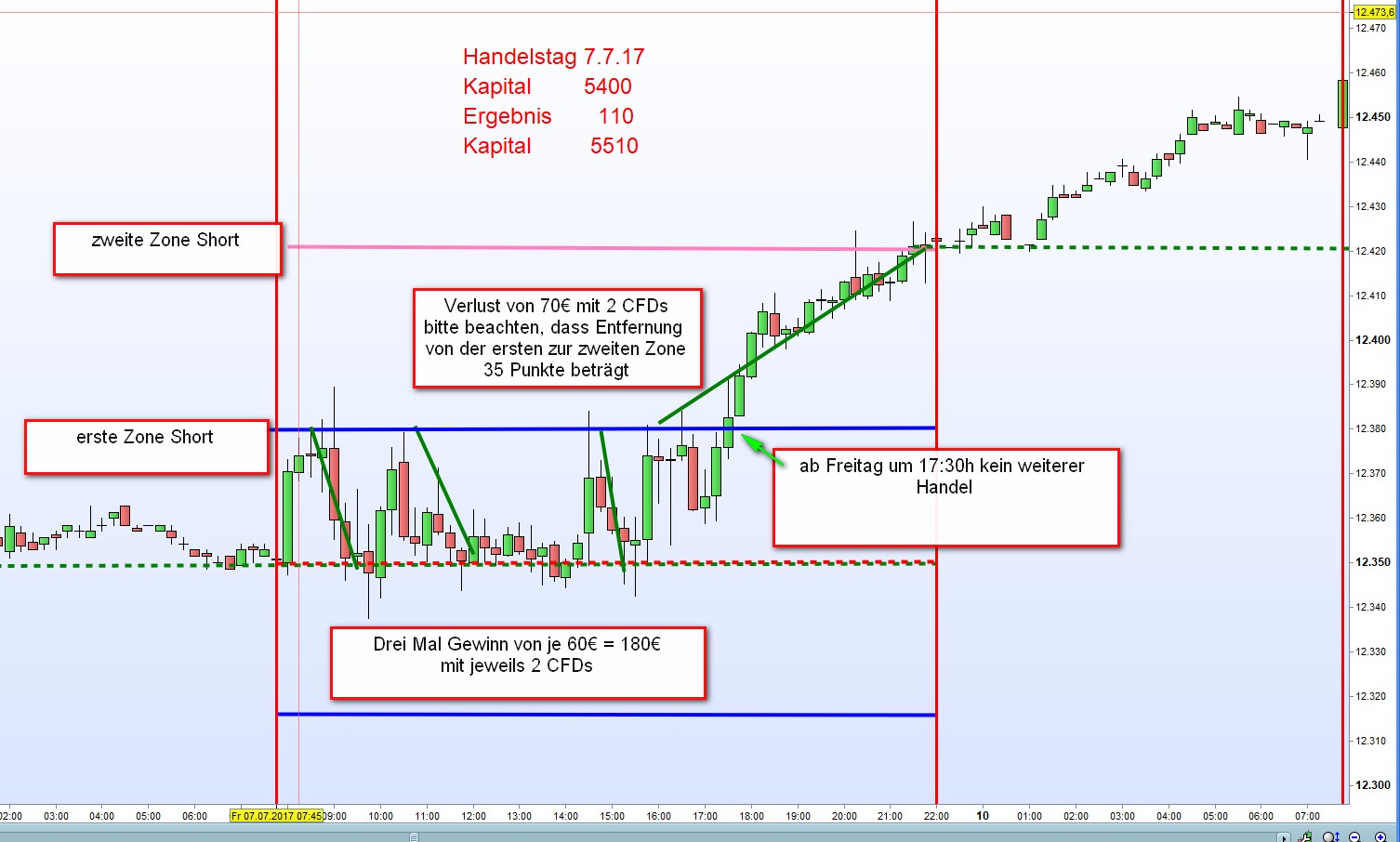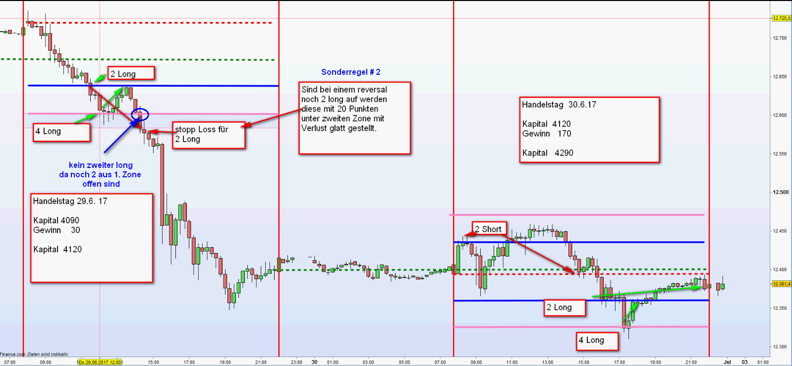Siehe eingefügter Chart vom 29.6.17. Wären an der zweiten Zone erneut 4 weitere CFDs Long eröffnet worden hätte sich der vorherige Tagesgewinn zu einem hohen Verlust mutiert. Ausnahme dieser Regel besteht wenn ein Doppel Gap vorliegt. Siehe eingefügter Chart. Für Erstleser Doppelgap: siehe Text der FDAX-TRADING-STRATEGIE.