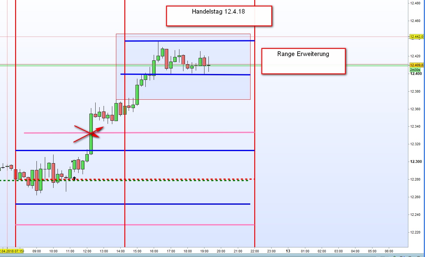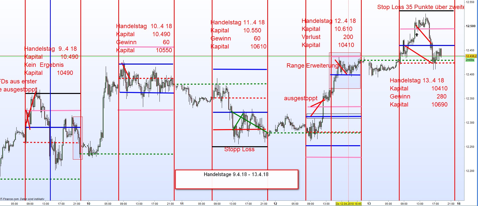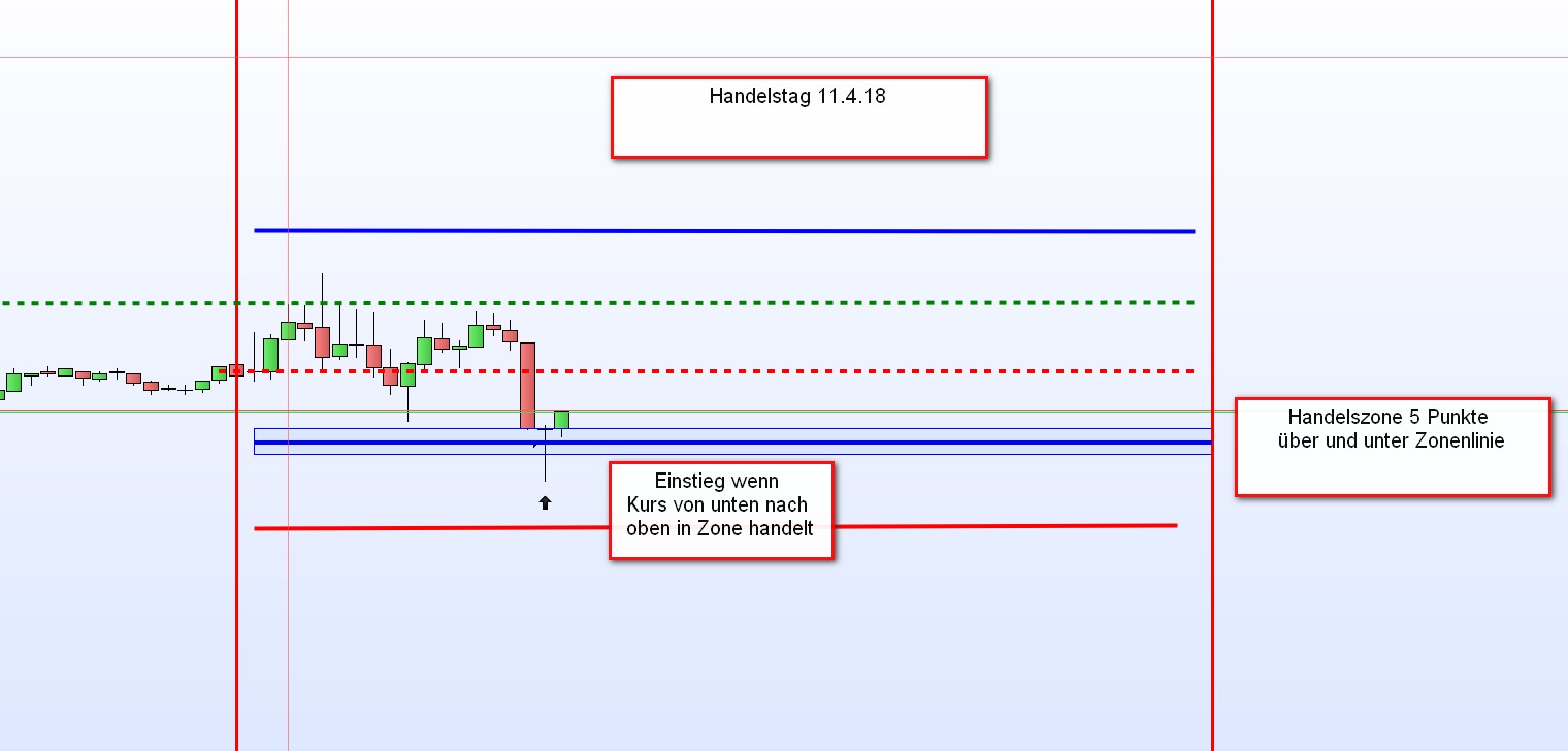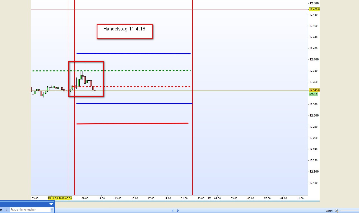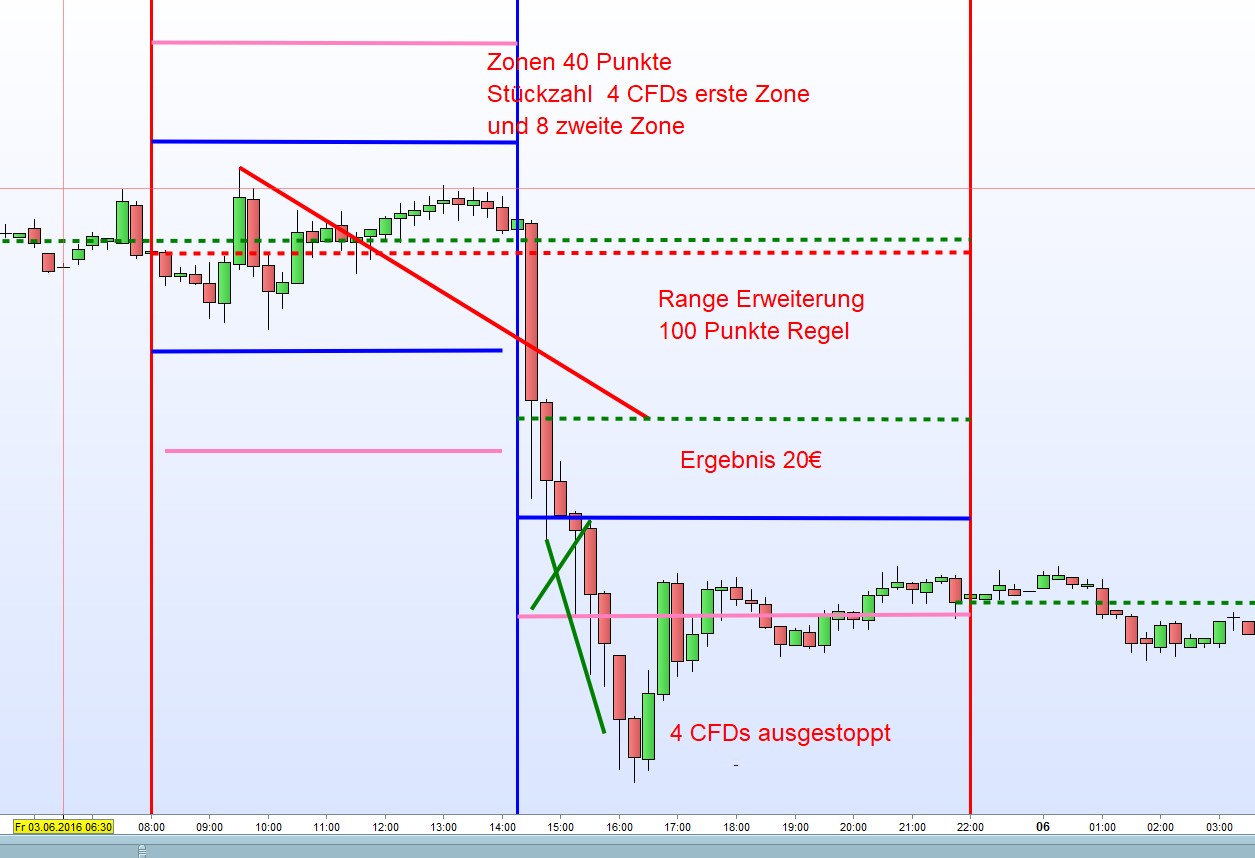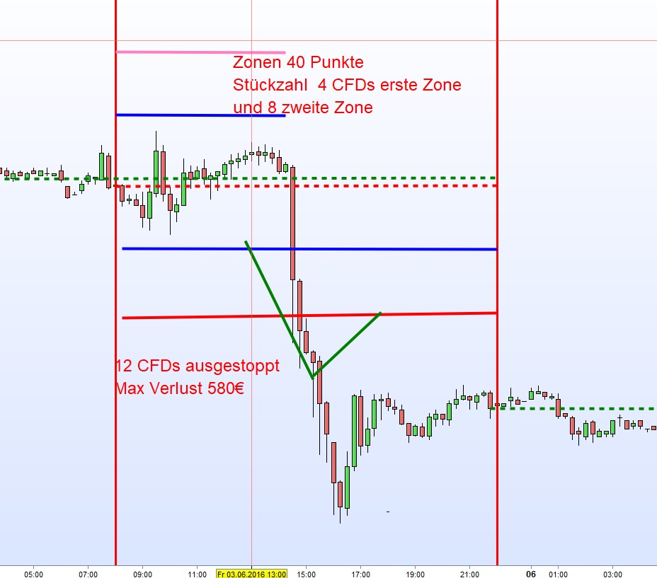 Entweder läuft diese Position in den Gewinn, wird ausgestoppt oder um 22:00h glatt gestellt. Nun sie wurde ausgestoppt. Am Ausstoppungspunkt wird dann die Range Erweiterung in Zonen eingeteilt und mit Glück den Verlust wieder ausgeglichen.