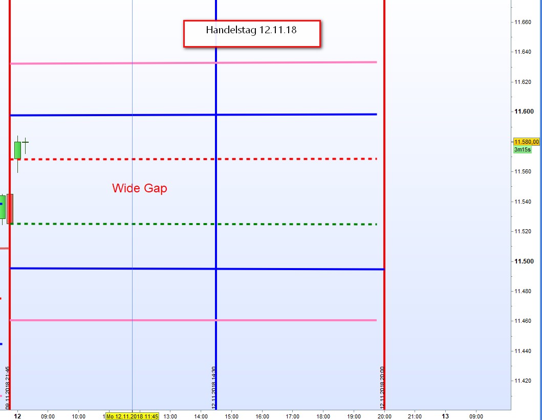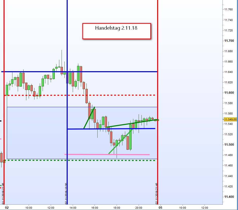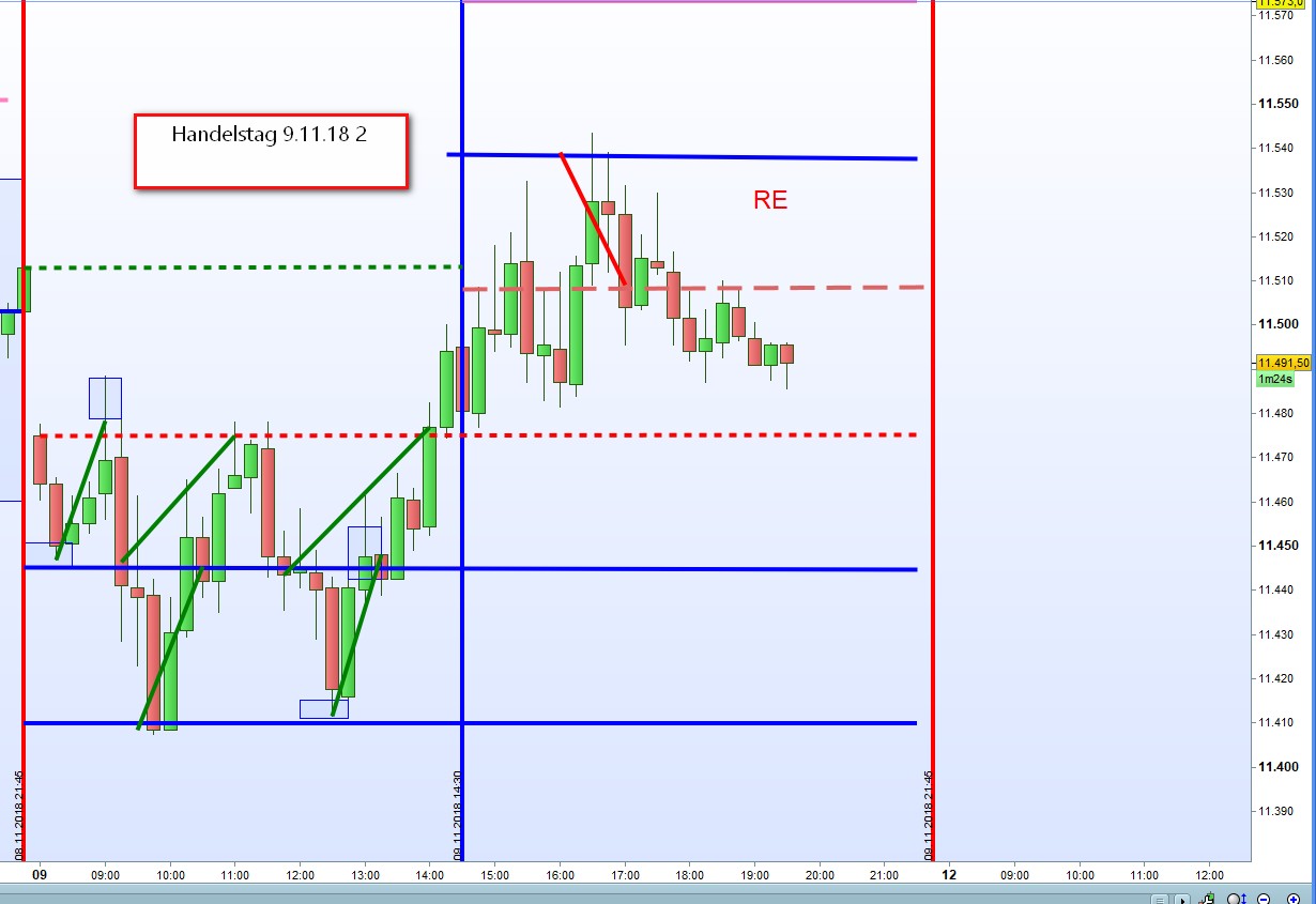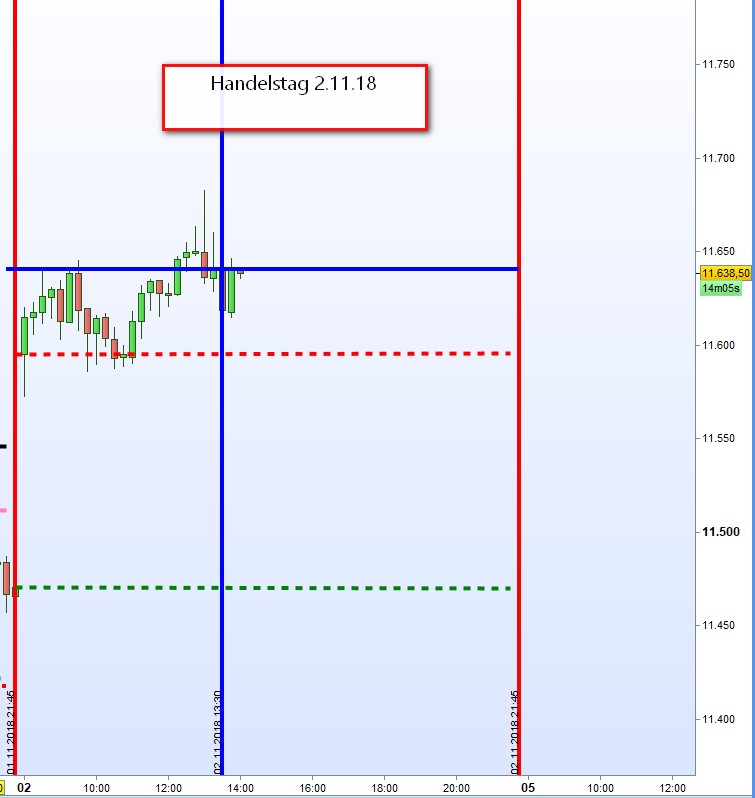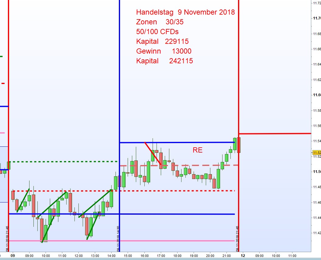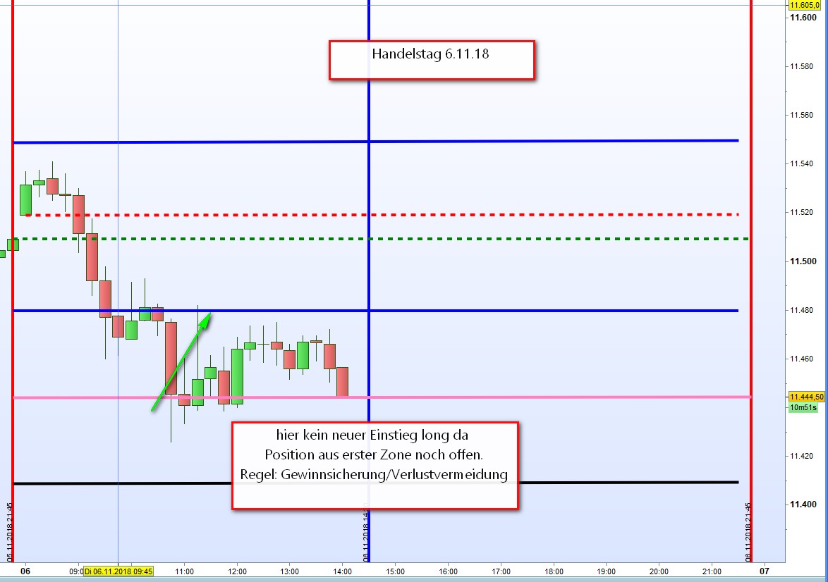 Wurden vormittags Positionen eröffnet und der Kurs konsolidiert über Zeit an einer Zonenlinie und tendiert nicht in die gewünschte Richtung, dann greift vor 14.30h ein Zeitstopp und die Position wird glatt gestellt. Zur Gewinnsicherung insbesondere dann, wenn vormittags bereits ein Gewinn erzielt wurde. Grund: US Wirtschaftsnachrichten um 14:30h