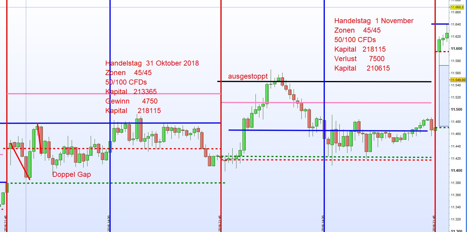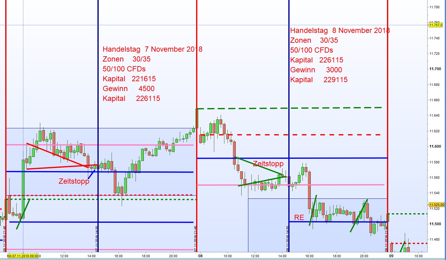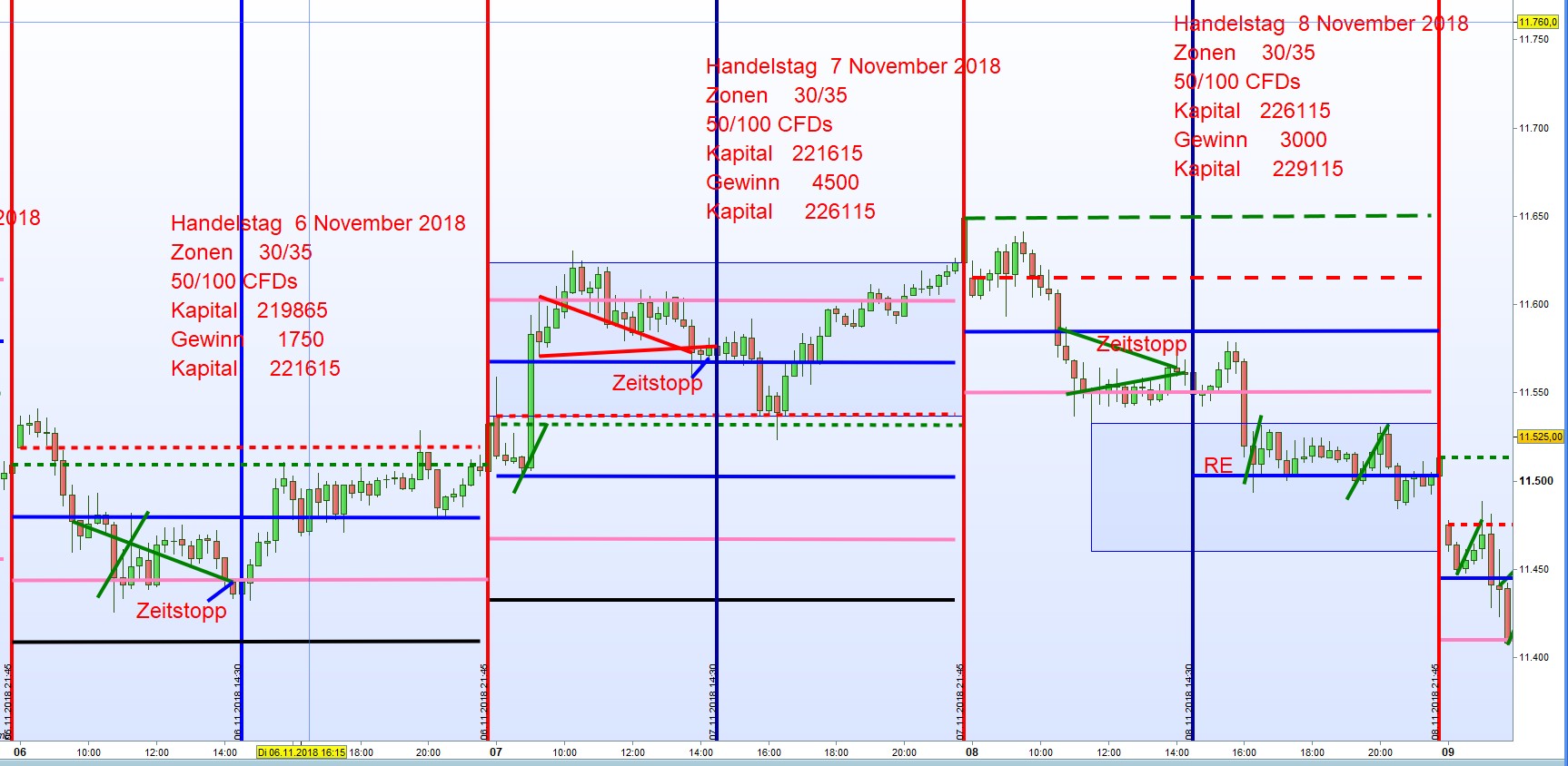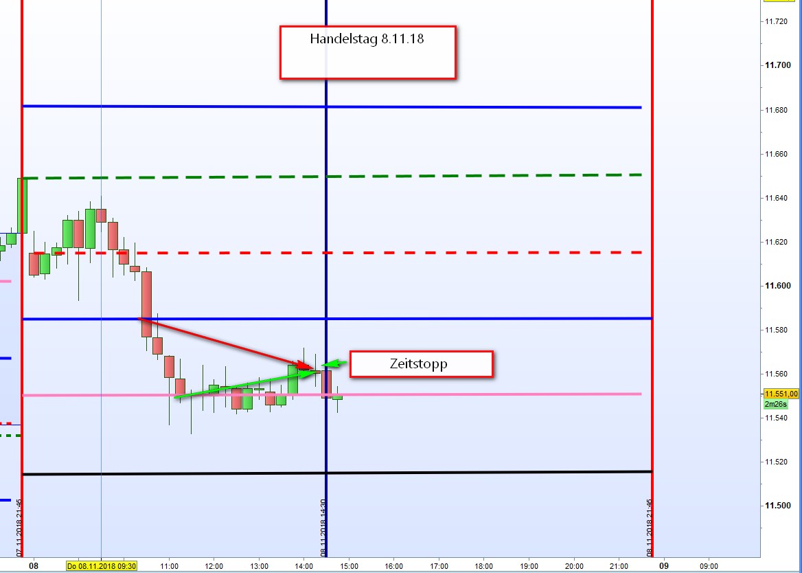 Seit Aufnahme des Zeitstopps in das Regelwerk hat sich das Ergebnis wesentlich verbessert. Zuweilen wird ein Mehrwert verhindert, 6 und 7 November, aber auch empfindliche Verluste verhindert. Im angefügten Chart gut zu erkennen. Anstatt Gewinn an dem Handelstag 8.11.18 wäre ein hoher Verlust entstanden.