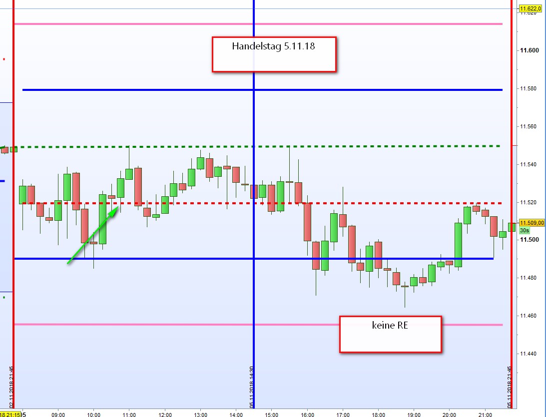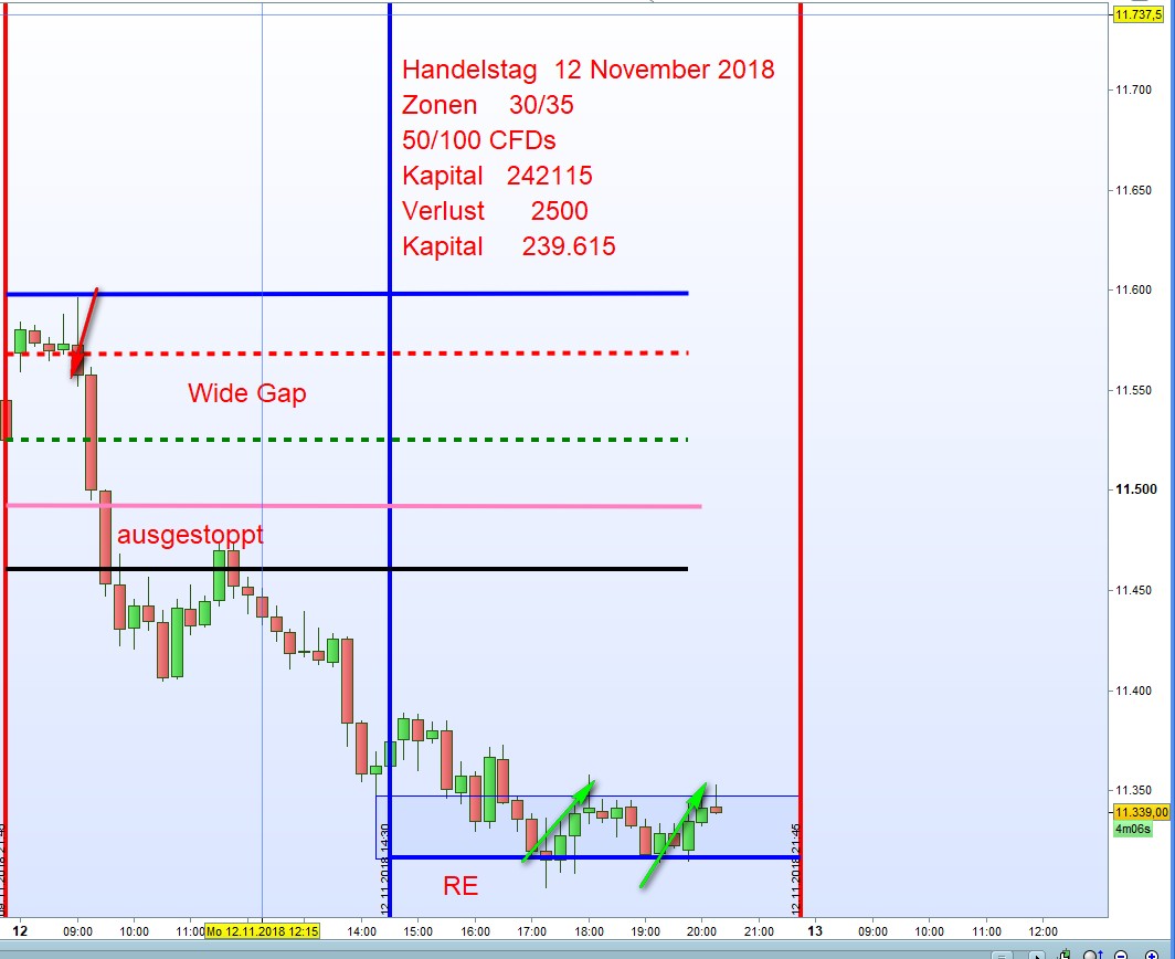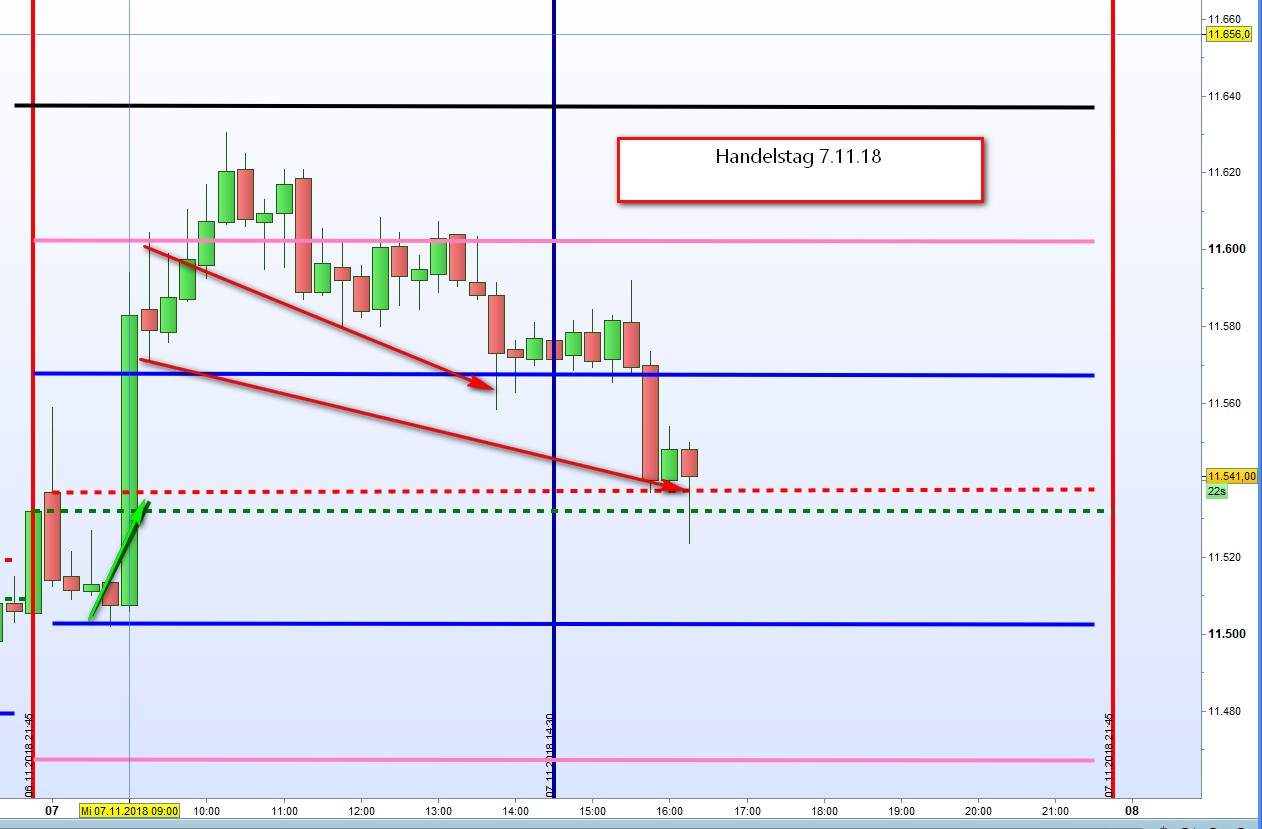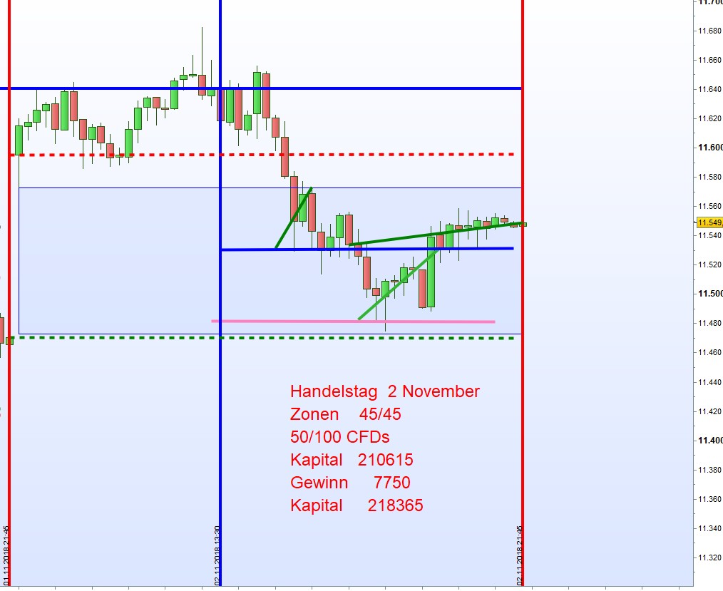 Seit Aufnahme des Zeitstopps in das Regelwerk hat sich das Ergebnis wesentlich verbessert. Zuweilen wird ein Mehrwert verhindert, 6 und 7 November, aber auch empfindliche Verluste verhindert. Im angefügten Chart gut zu erkennen. Anstatt Gewinn an dem Handelstag 8.11.18 wäre ein hoher Verlust entstanden.