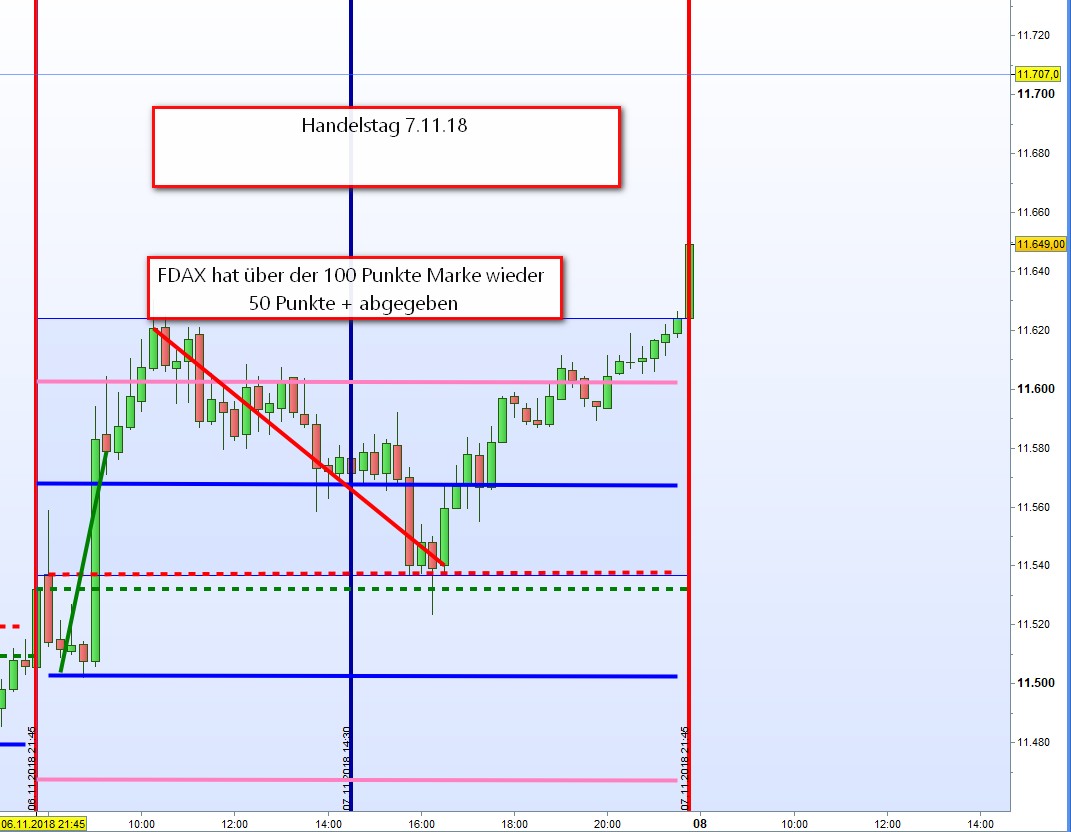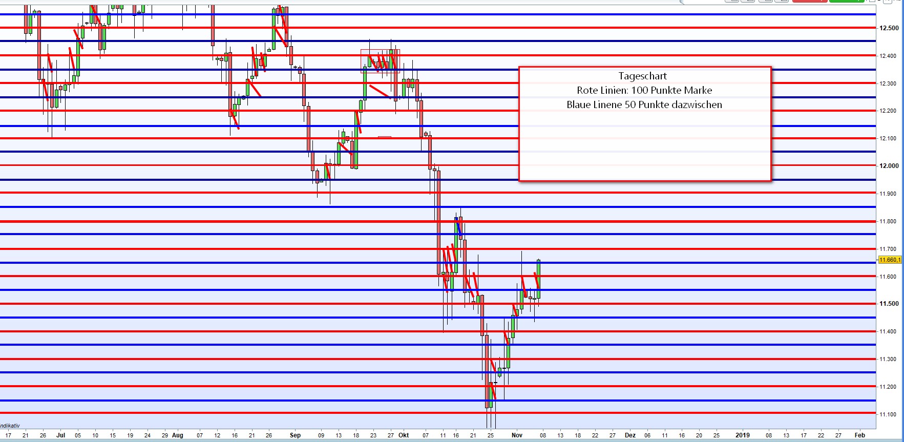 Dazu der aktuelle Tageschart. Für den heutigen Tag kann man aus der Kerze nicht erkennen, dass auch heute nach Erreichung der 100 Punkte Marke wieder um 50 Punkte korregiert wurde. Das ist absolut nicht immer Intraday der Fall aber auf Sicht immer.