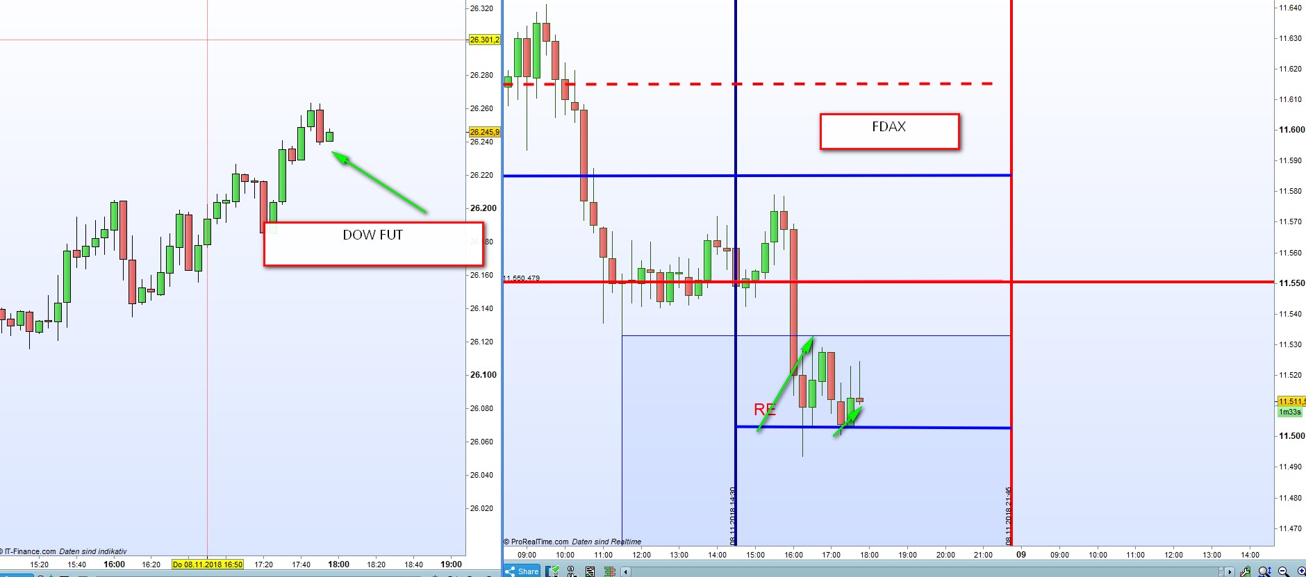Wie erhofft konnte nach dem Zeitstopp um 14:30h noch ein Gewinn in der Range Erweiterung erzielt werden. Der Handelstag ist zwar noch nicht zu Ende aber Gewinnmitnahmen schaden nicht. Aus dem Chart ist zu ersehen, dass FDAX am Tagestief und der DOW am Tageshoch notiert. Gibt der DOW nach läuft der FDAX unweigerlich in den Verlust.