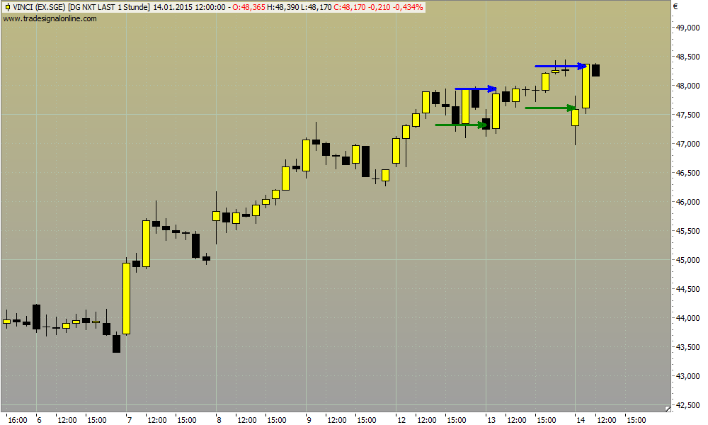 Sehr schwierige Entscheidung zwischen den beiden. Vinci zwar mit der Umkehrkerze, aber dafür auch schon wieder weit vom Stundentief entfernt im Vergleich zu Merck. Hätte fast beide gekauft.