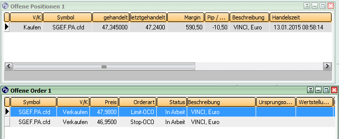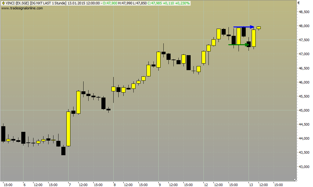 Dass Vinci im Tageschart ein Longkandidat ist, brauche ich nicht extra einstellen. Den Aufwärtstrend erkennt man auch im Stundenchart noch sehr schön. Die erste Stundenkerze heute klar bearisch, damit kam ich so günstig rein wie in keinen anderen potentiellen Longkandidaten (auch wenn der Entry schlecht war wenige Minuten vor 10 Uhr). Das Kursziel wäre formell knapp über 48€ gelegen, habe ich wegen dem gestrigen Doppeltopp dann auf 47,98€ gelegt. Stop-Loss war etwas zu großzügig, damit eine noch höhere Stückzahl vergeben.