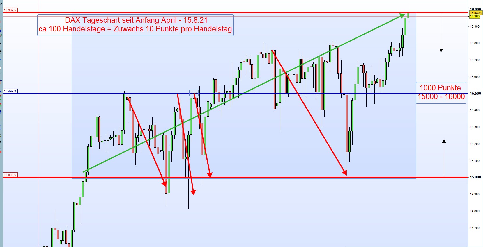 Im angefügten Chart hat der DAX von der Benchmark 15000 bis jetzt 16000 in 100 Handelstagen jeweils 10 Punkte zugelegt. In der Zwischenzeit aber auch schon +/- 0 notiert.