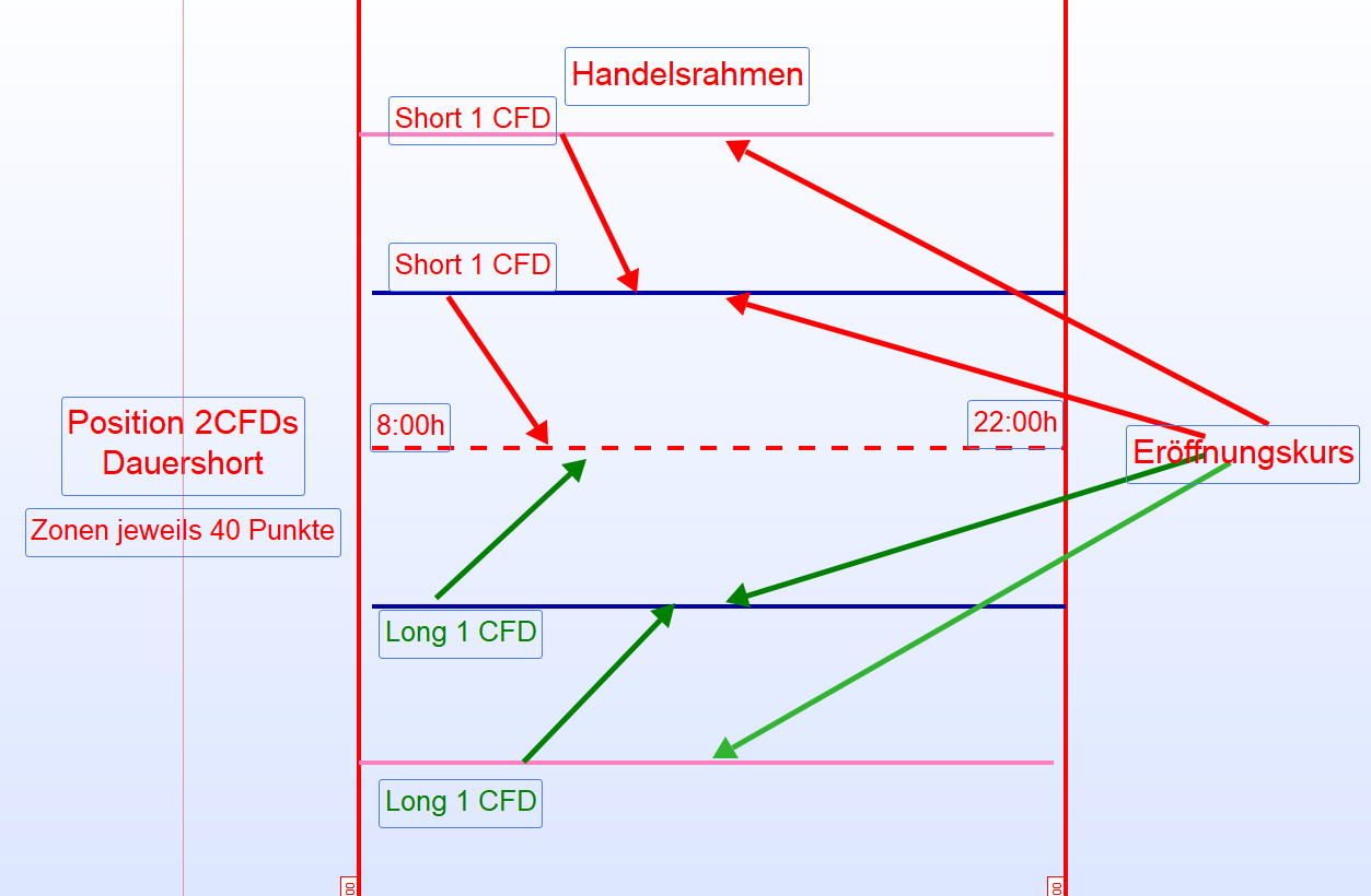 Wird allein mit dieser Maßnahme zum Beispiel bei einem CFD Short als Dauerposition mit dem zusätzlichen Handel täglich im Schnitt ein Gewinn von nur 10 Punkten erzielt, dann kann auf Sicht nie ein Verlust entstehen.