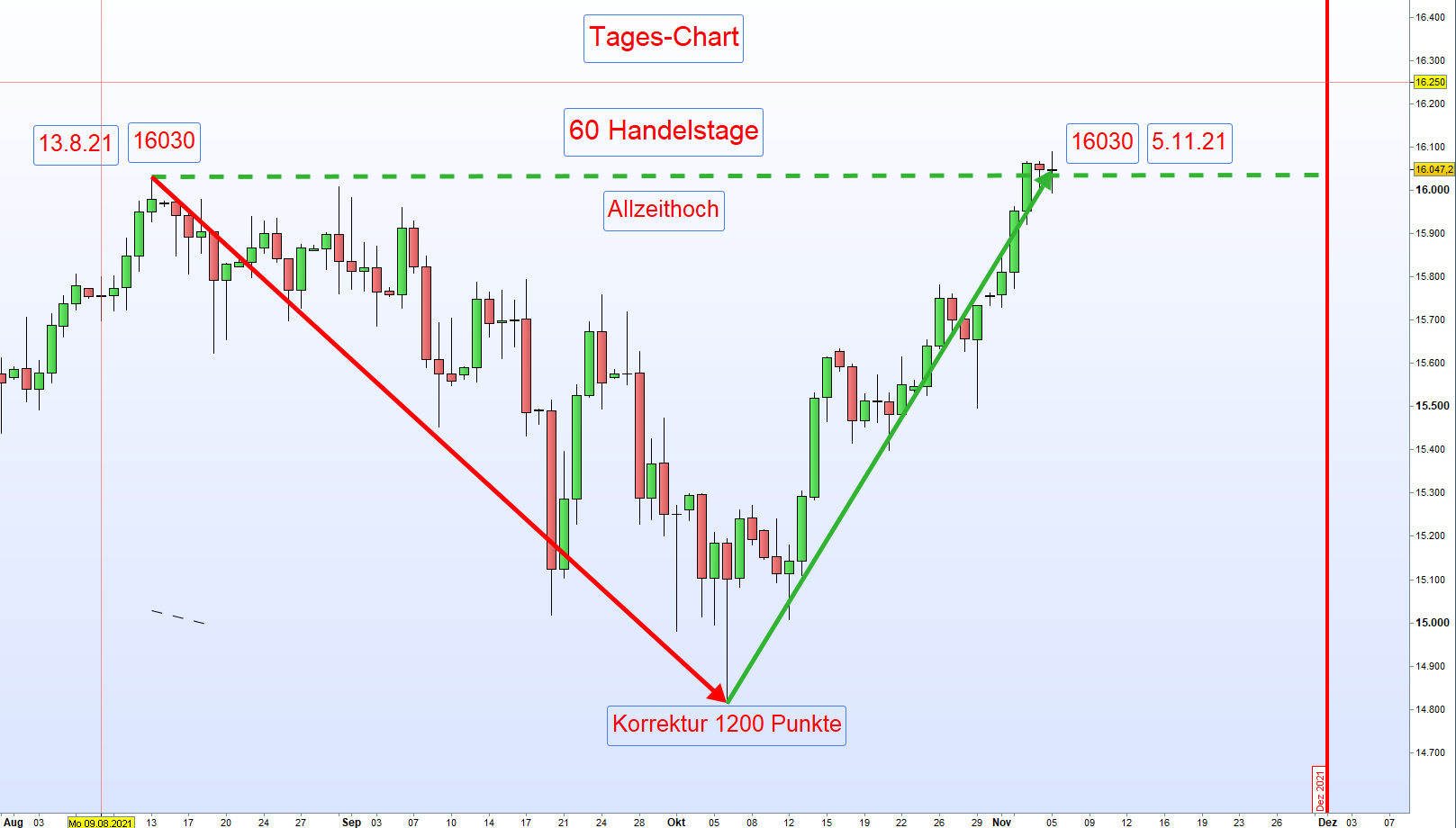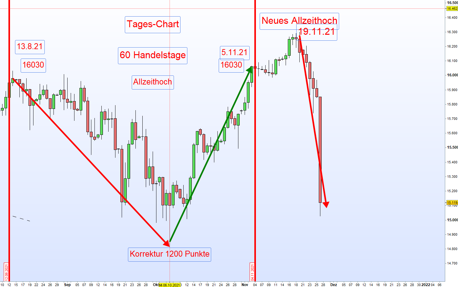 Es ist natürlich zweckmäßig für einen Erstanwender dieses Ansatzes bei einem neuen Jahreshoch, von dem eine statistisch erwiesene Korrektur von mindestens 1000 Punkte erfolgen kann, einzusteigen.