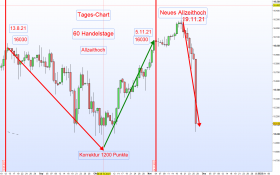 Es ist natürlich zweckmäßig für einen Erstanwender dieses Ansatzes bei einem neuen Jahreshoch, von dem eine statistisch erwiesene Korrektur von mindestens 1000 Punkte erfolgen kann, einzusteigen.