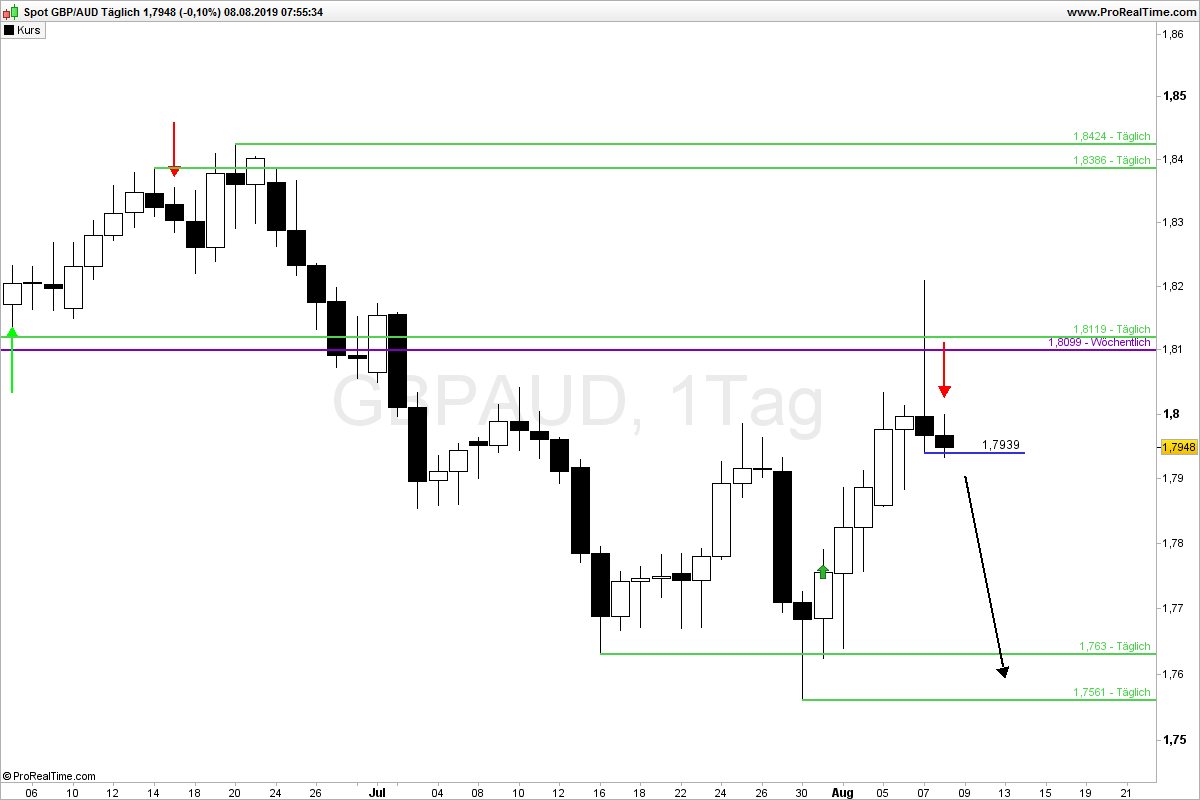 Der Kurs bildet kurz vor einer Widerstandsmarke eine Kerze mit recht stark ausgeprägtem Docht. Die Folgekerze ist ein Insidebar welche von einer starken schwarzen Kerze gefolgt wird. Hier scheint deutliches Abwärtsmomentum in den Markt zu kommen.