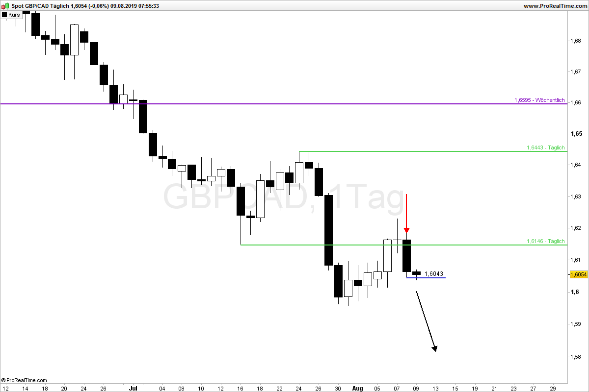 Der Kurs bildet kurz vor einer Widerstandsmarke einen bärischen Outsidebar. Hier scheint eine deutliche Umkehr zu entstehen, womit der Markt neues Potential für Abwärtsmomentum erhält.